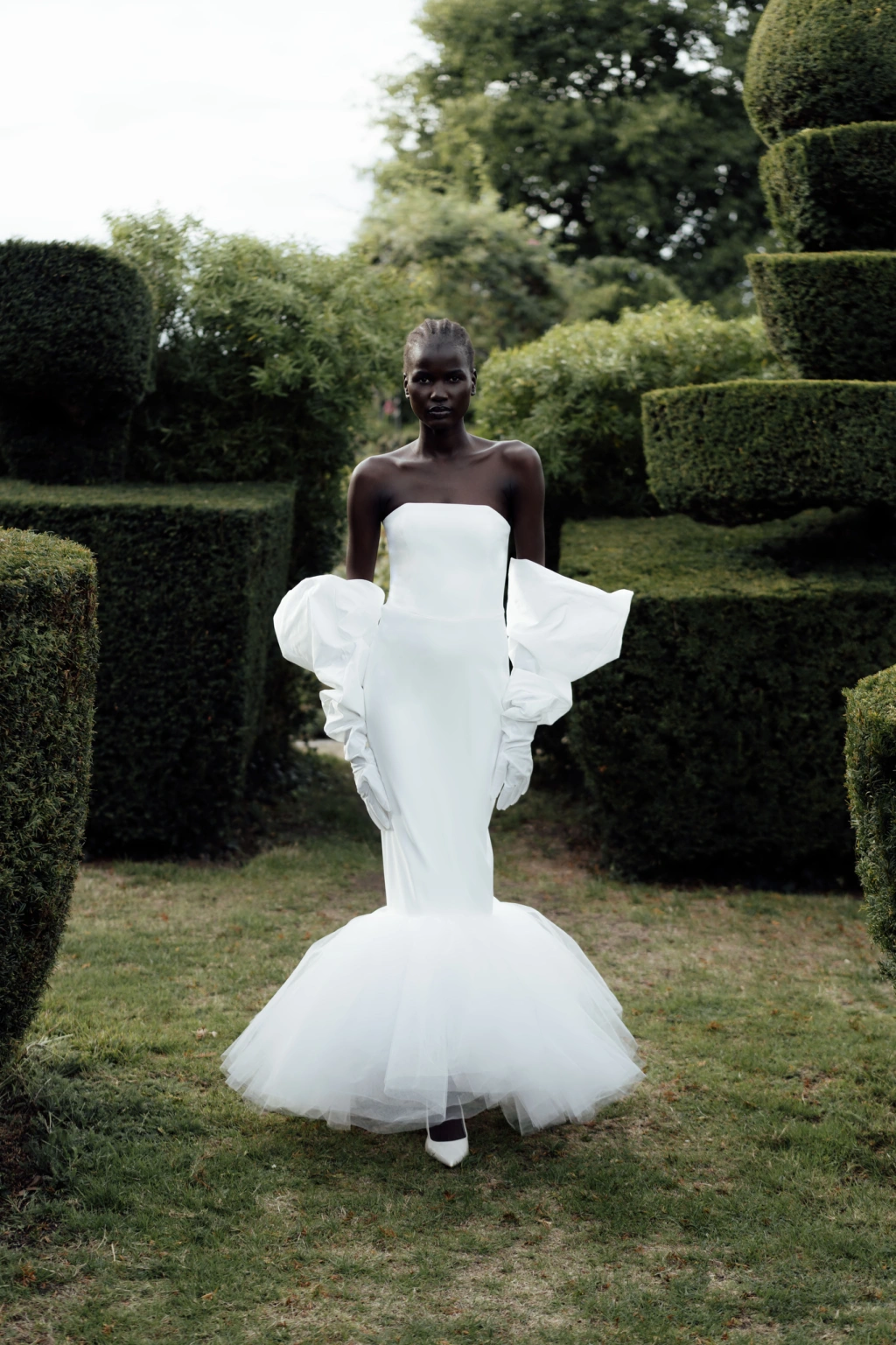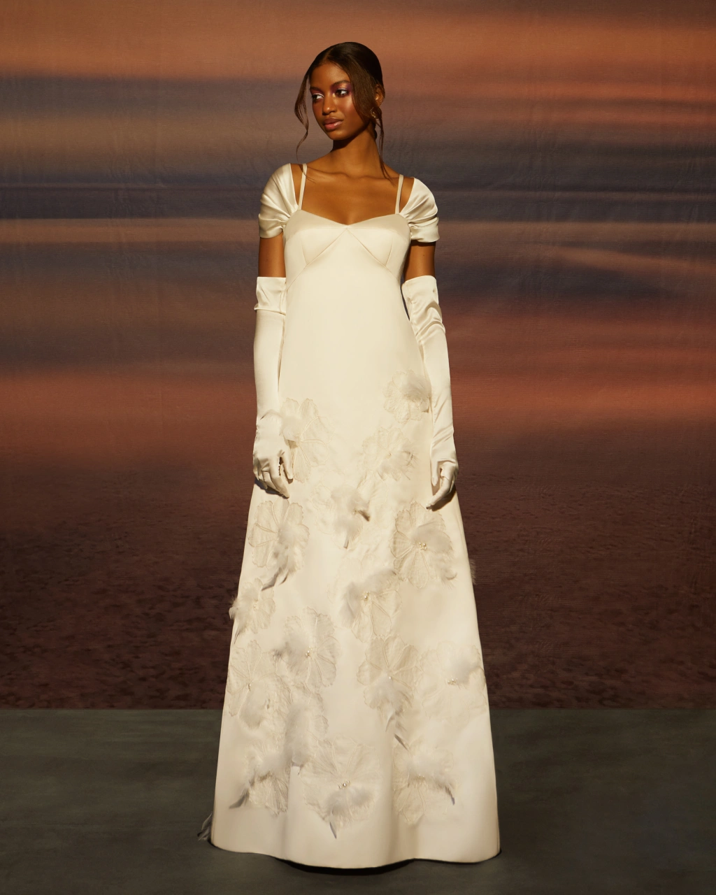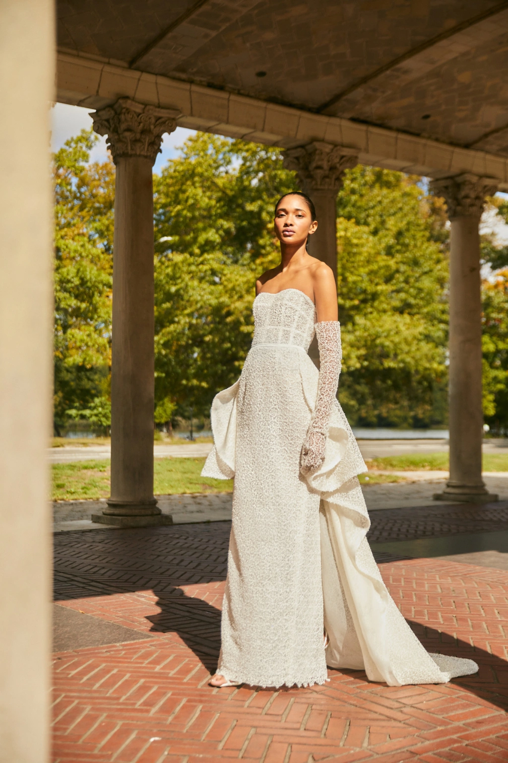 Gloves — an accessory steeped in wedding-day etiquette — reigned, but unconventional materials and playful proportions similar to those spotted on the spring runways of Prabal Gurung, Simone Rocha and Bottega Veneta were used to buck tradition, further aligning trends in bridal with those in ready-to-wear.