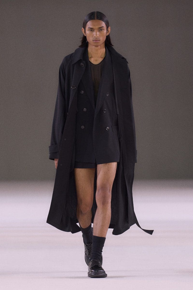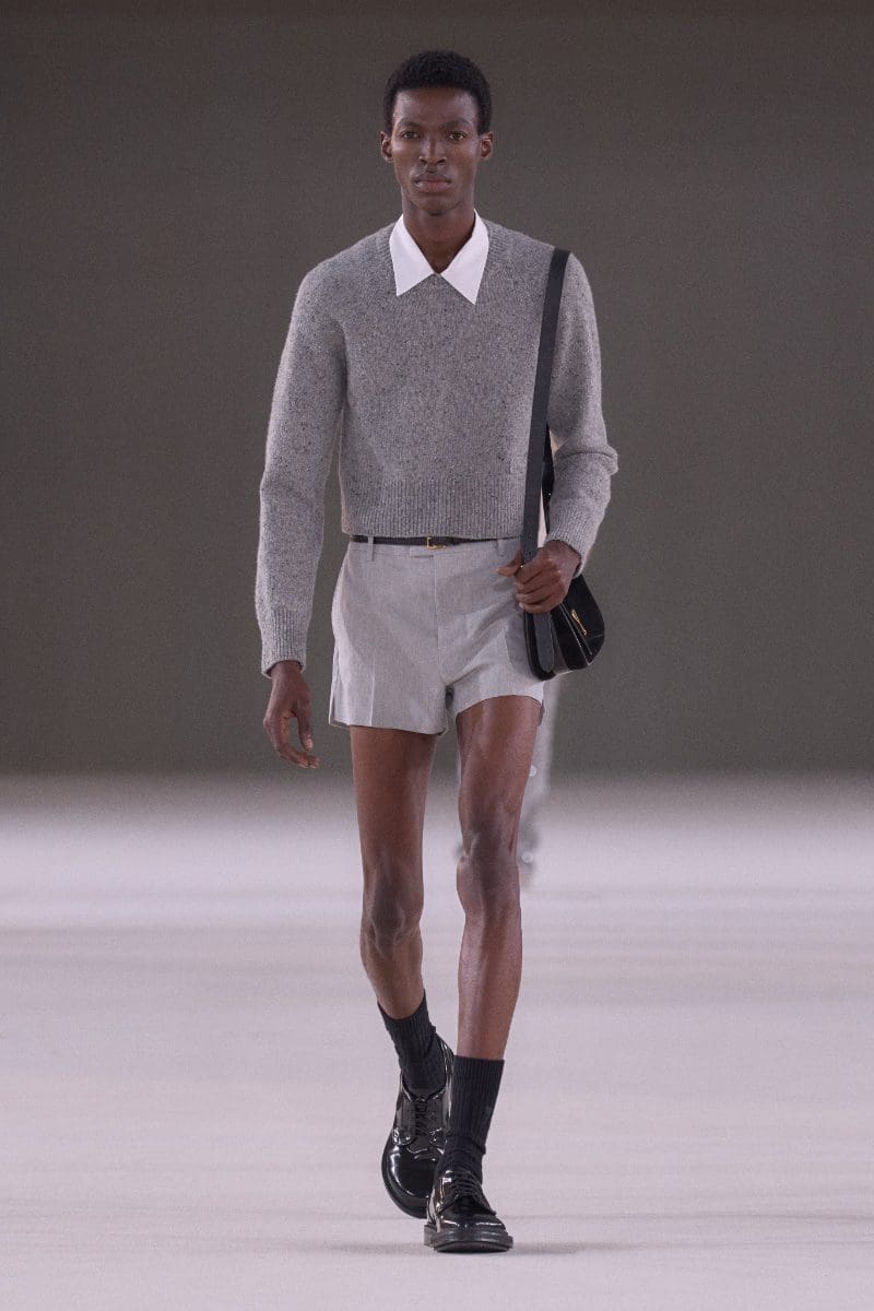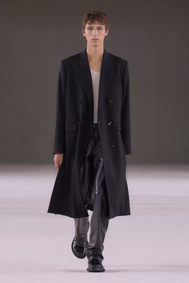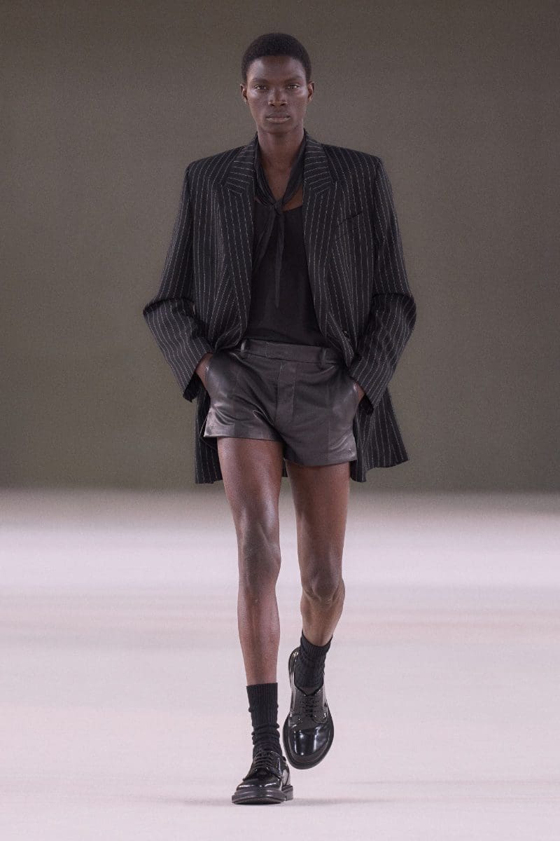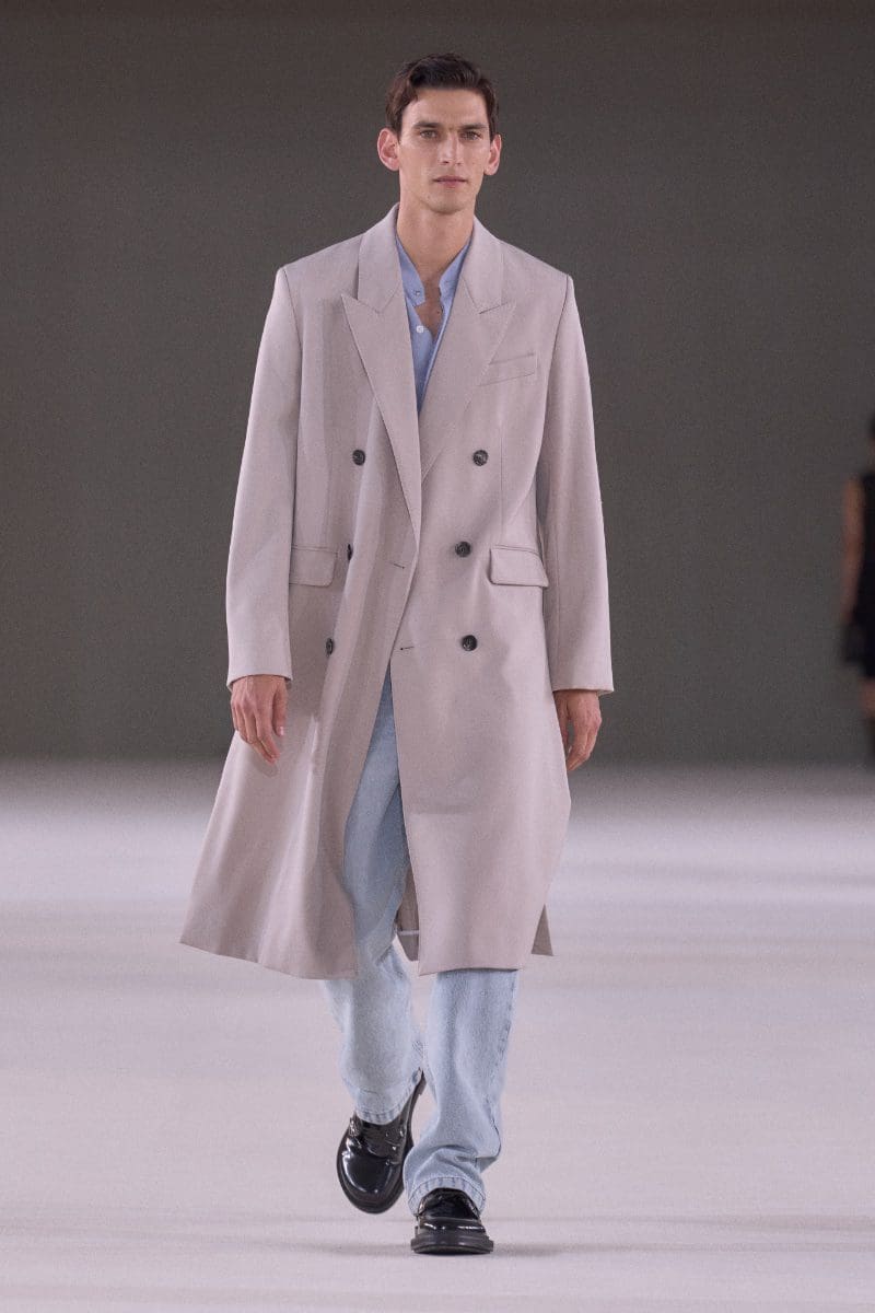 The collection is an ode to minimalism. Long trench coats and double-breasted jackets exude an aura of polished grace. Pleated trousers and pinstripe suits evoke timeless sophistication, while leather shorts and light-wash bootcut jeans add a contemporary, playful edge.