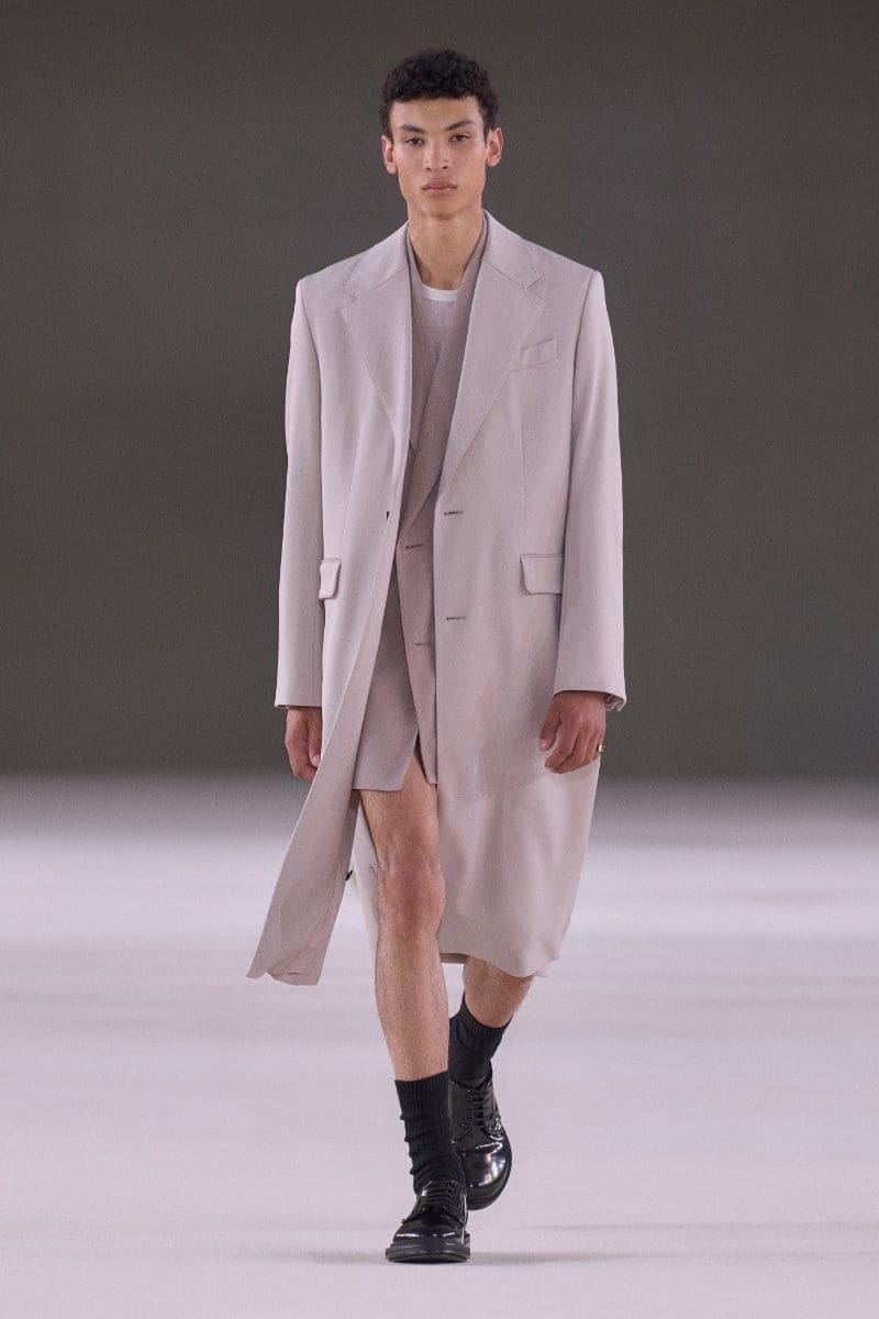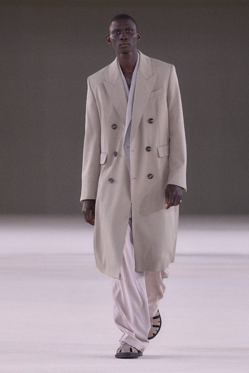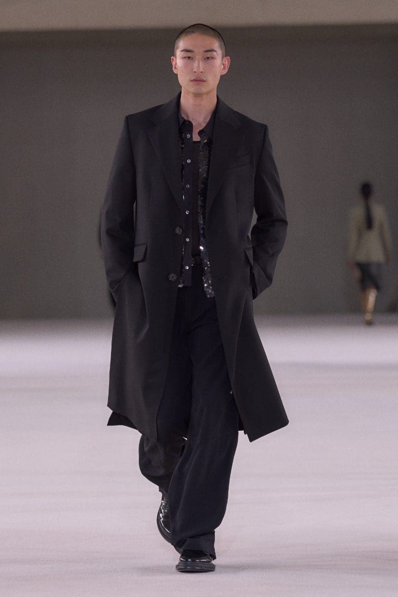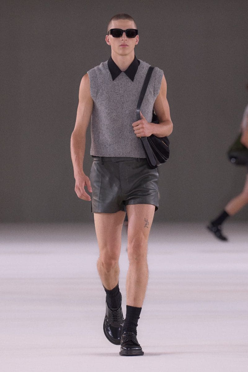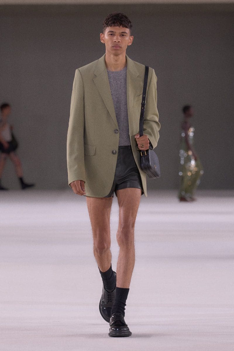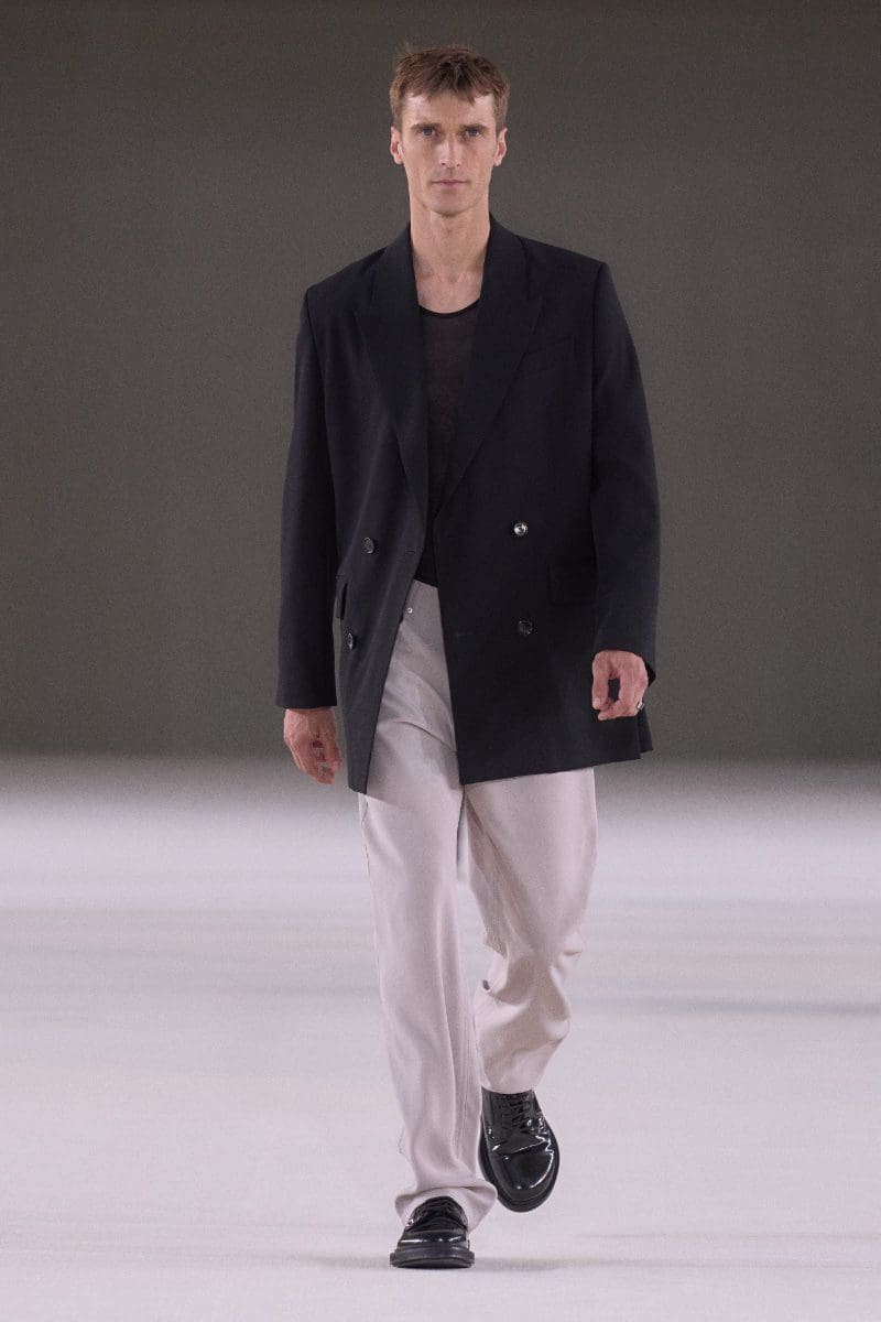 The collection is an ode to minimalism. Long trench coats and double-breasted jackets exude an aura of polished grace. Pleated trousers and pinstripe suits evoke timeless sophistication, while leather shorts and light-wash bootcut jeans add a contemporary, playful edge.