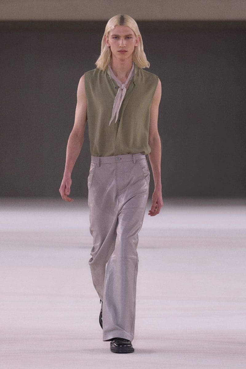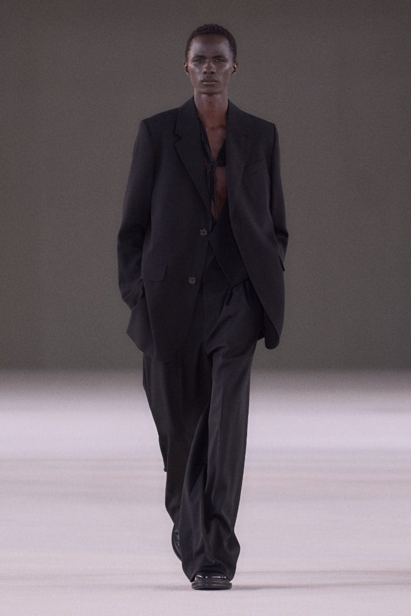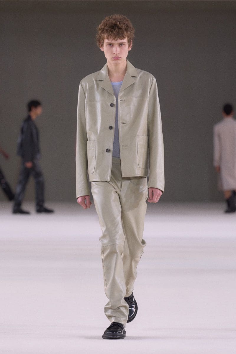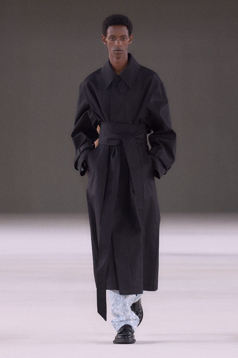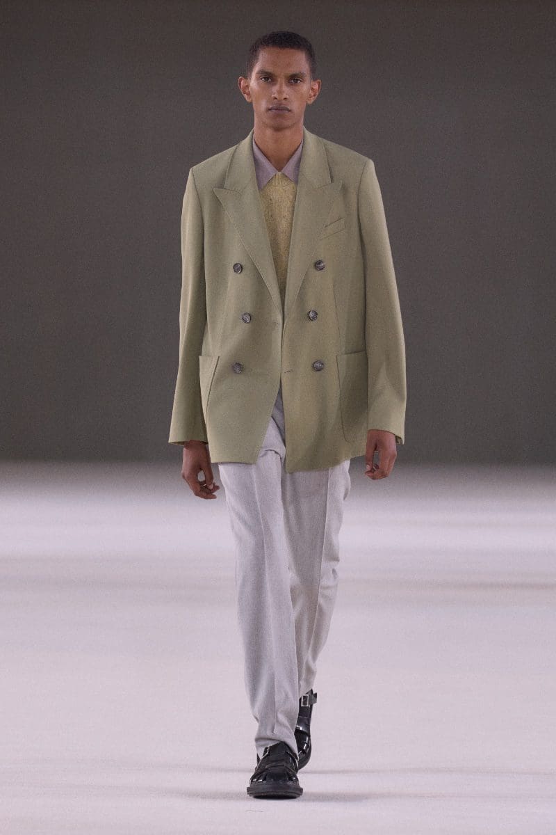 The collection is an ode to minimalism. Long trench coats and double-breasted jackets exude an aura of polished grace. Pleated trousers and pinstripe suits evoke timeless sophistication, while leather shorts and light-wash bootcut jeans add a contemporary, playful edge.