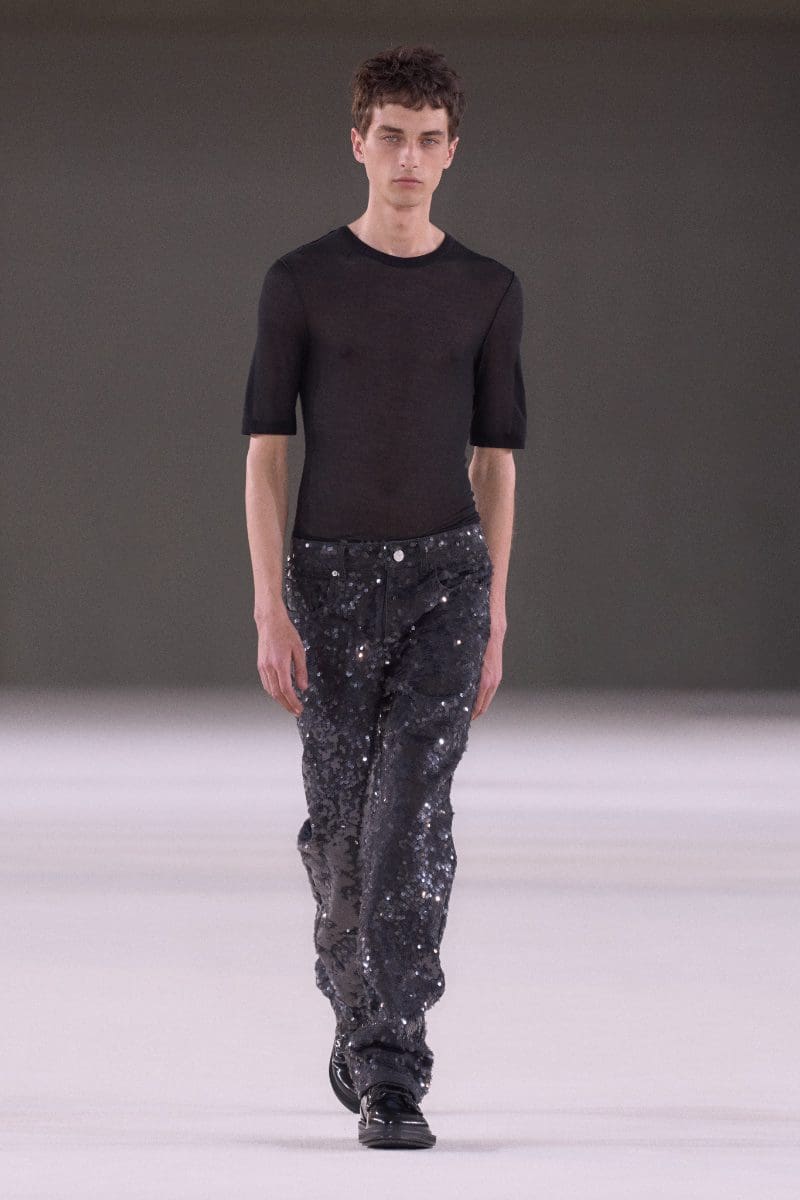 The collection also features voluminous tailoring paired with relaxed henley tanks and point collar shirts, epitomizing a laid-back silhouette. Shrunken sweaters and skinny scarves reflect subtle, fashion-forward innovation, while sequined tops and pants add a dash of glamour.