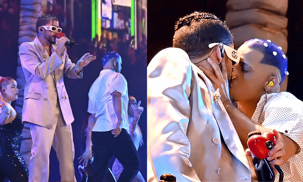 The performance – surrounded by Dominican Republic flags and dancers dressed in over-the-top wedding dresses screaming “bi rights” – saw Bad Bunny snog a female back-up dancer before turning to a male dancer.