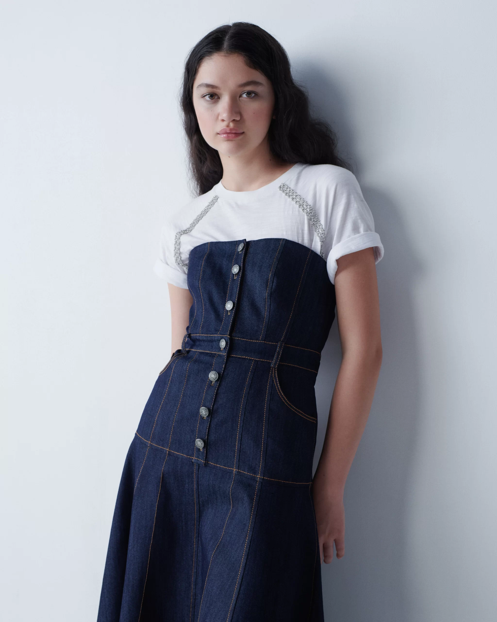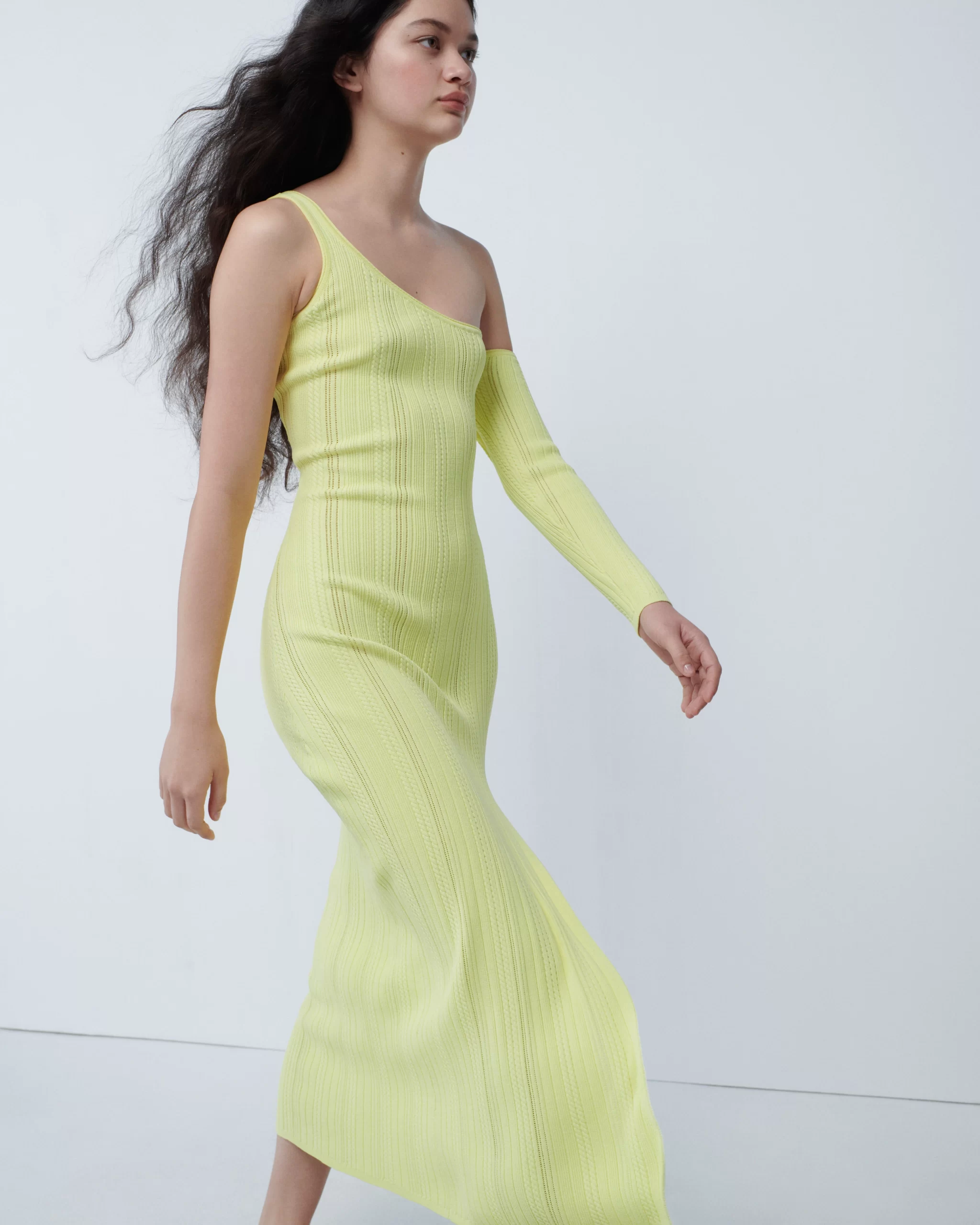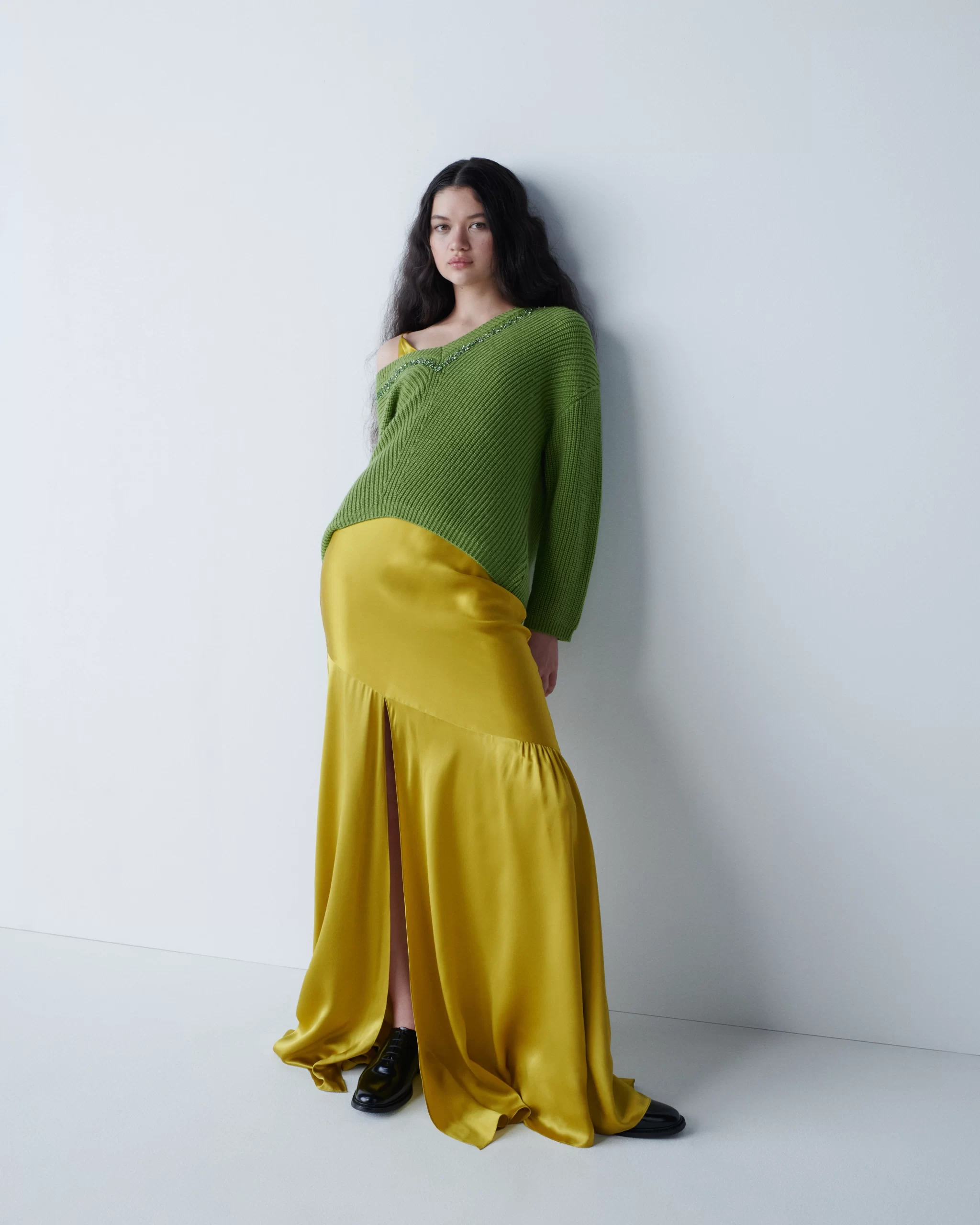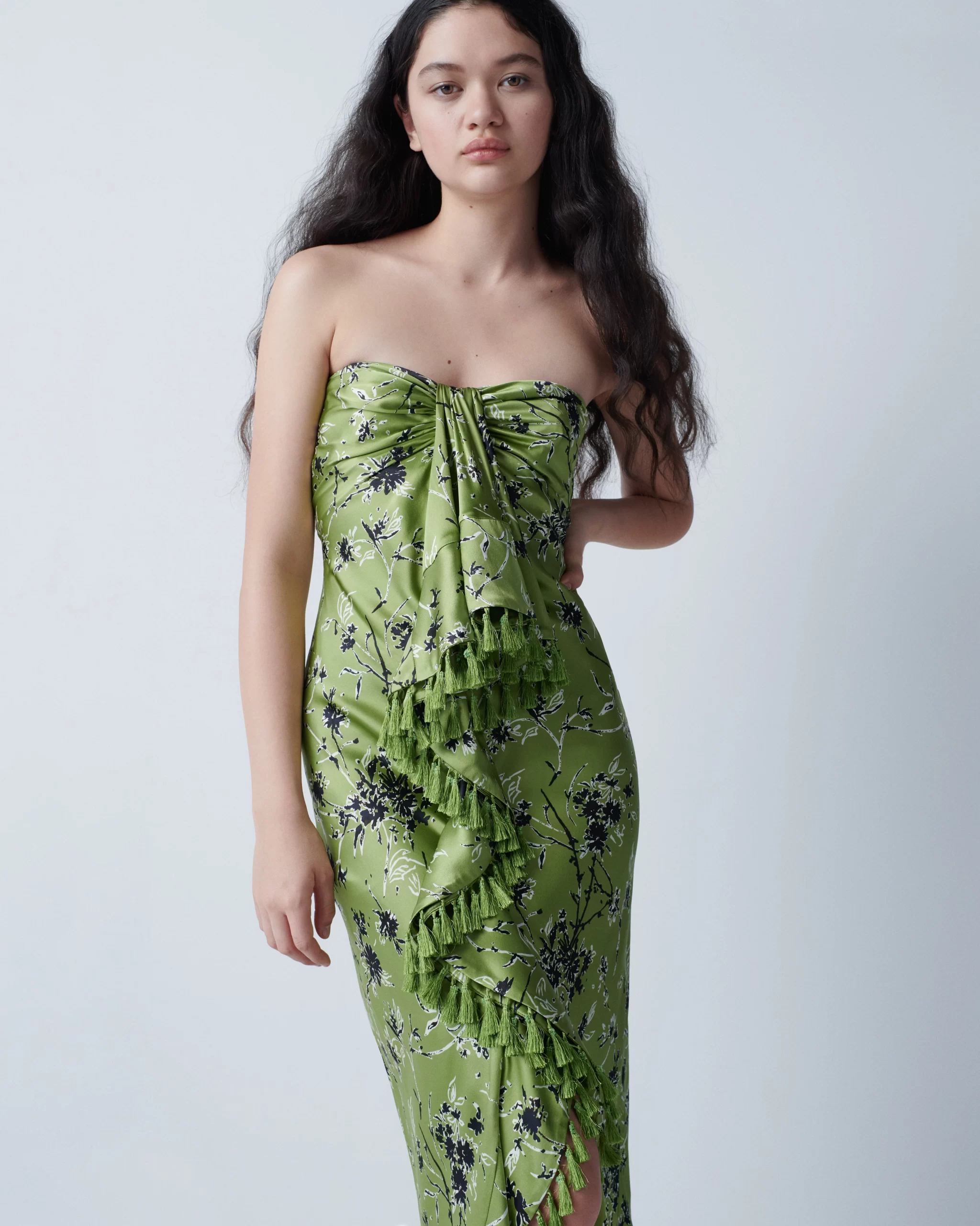Key pieces: A blue satin dress with twist detail paired with matching blazer with grommet details; sexy dresses in sophisticated shapes; a mix of deep blue denim options (part of her Tous Les Jours line); neon yellow single strap knit dress; striped colored separates; one-piece denim dress with white T built in; floral print daydress; strapless green floral print dress for night.