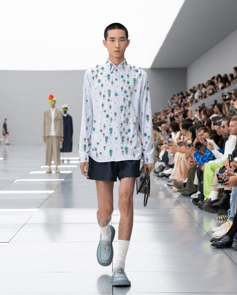 The spring-summer 2024 collection takes us on a sartorial journey from the salon to the street, from the New Look to the New Wave. It explores styles from various epochs, creating a ‘mechanical garden of hommes fleurs.’ Traditional British tailoring merges with haute couture tailleur, highlighting the interconnected origins of menswear and womenswear.