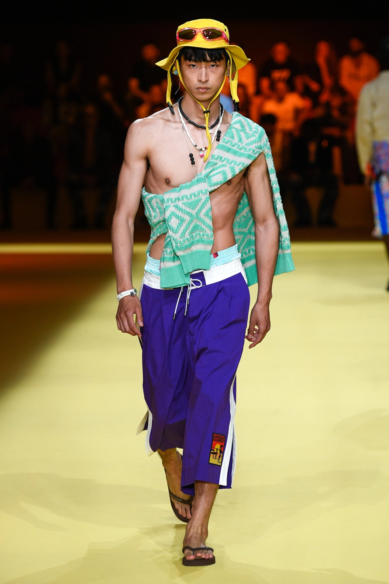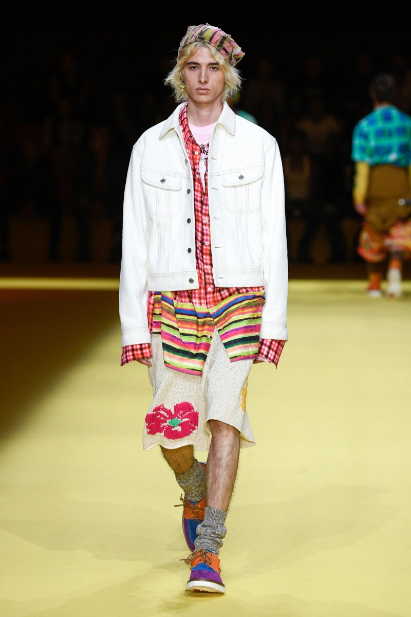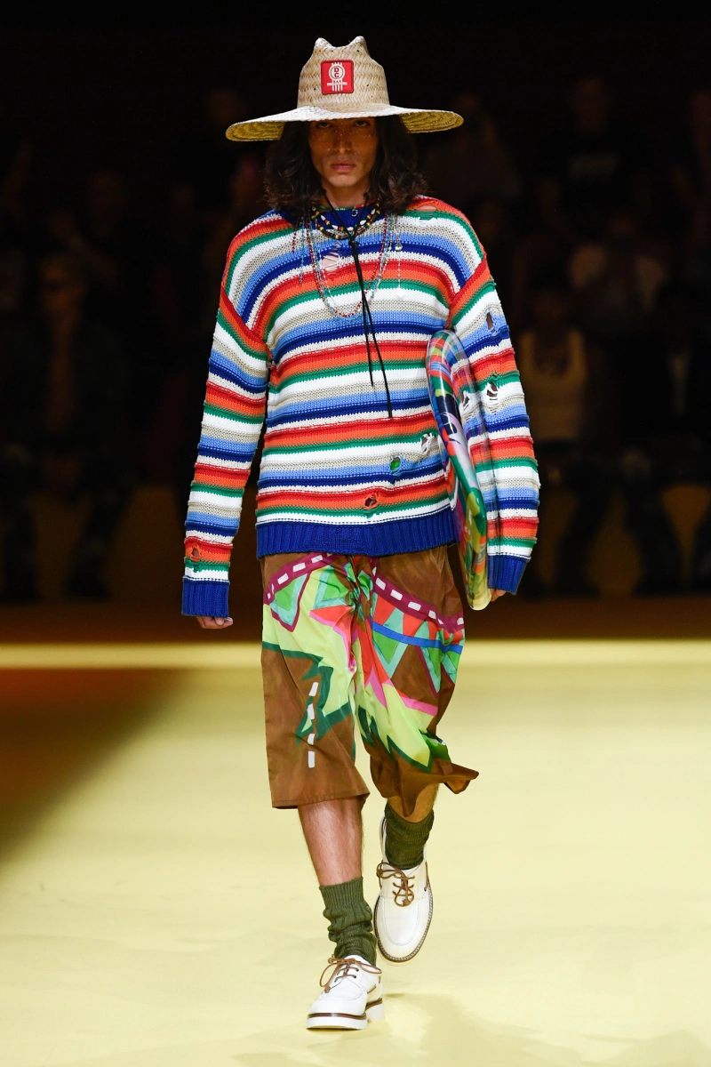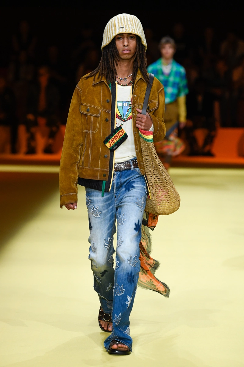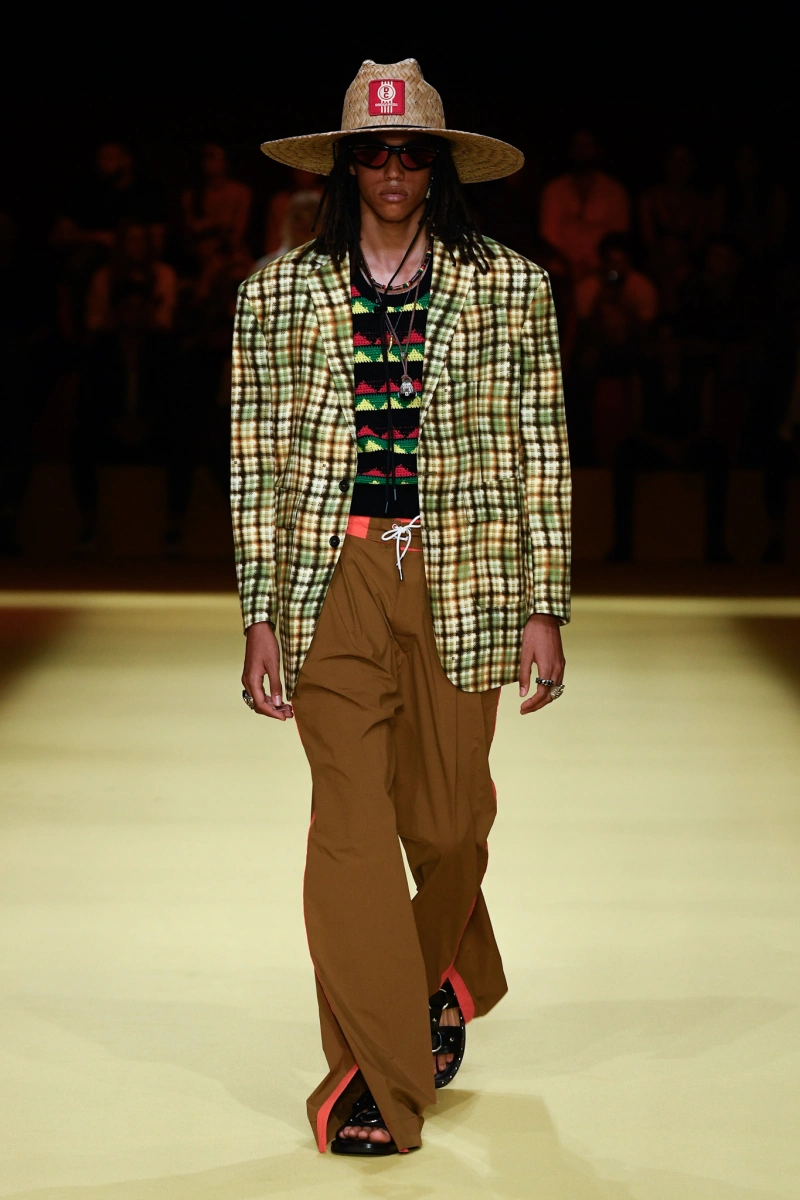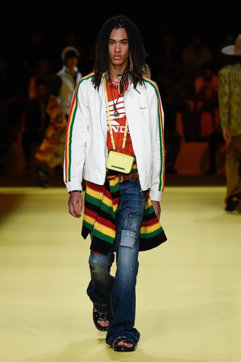 Further nods to Jamaica popped up through yellow-black-and-green striped knits among the heavily-layered looks the duo conjured. A clash of floral prints, checkered patterns, tie-dye effects, denim patchwork, nylon shorts and ‘70s flared pants dragged around the expansive runway, conveying a free-spirited attitude. Sarongs tied at the waist featured swirling designs and sun-like motifs in vibrant colors.