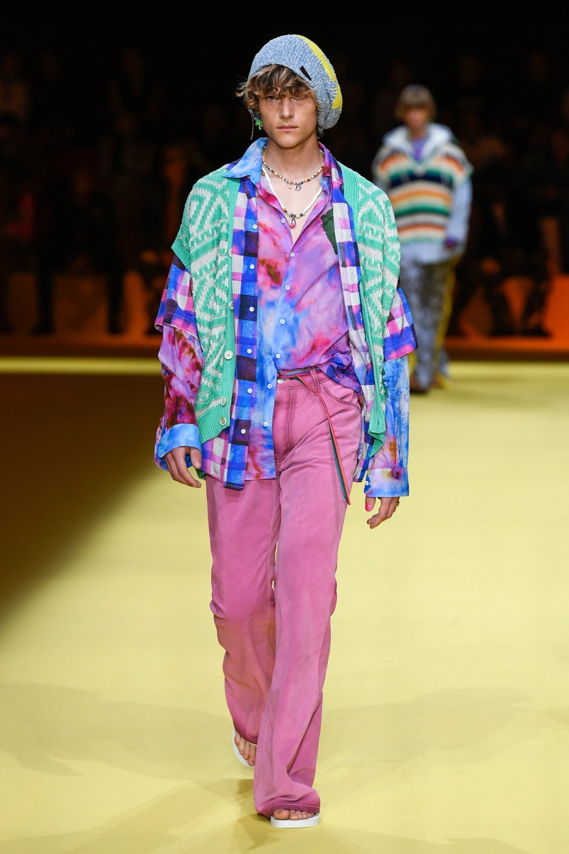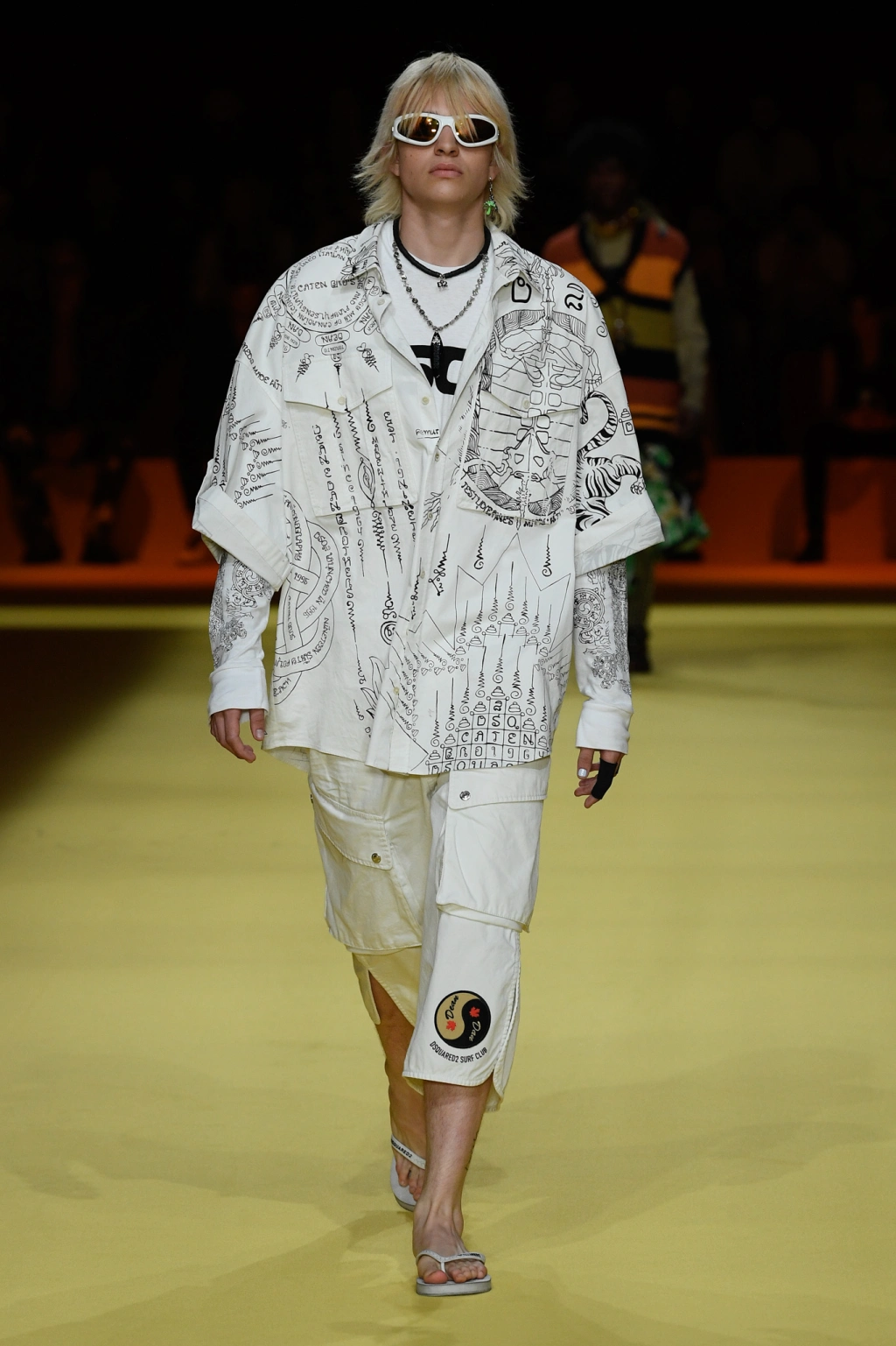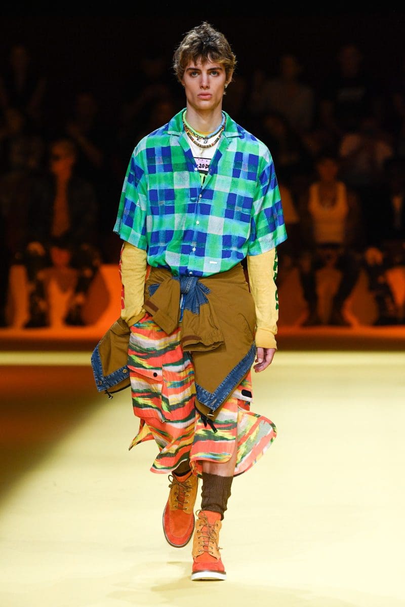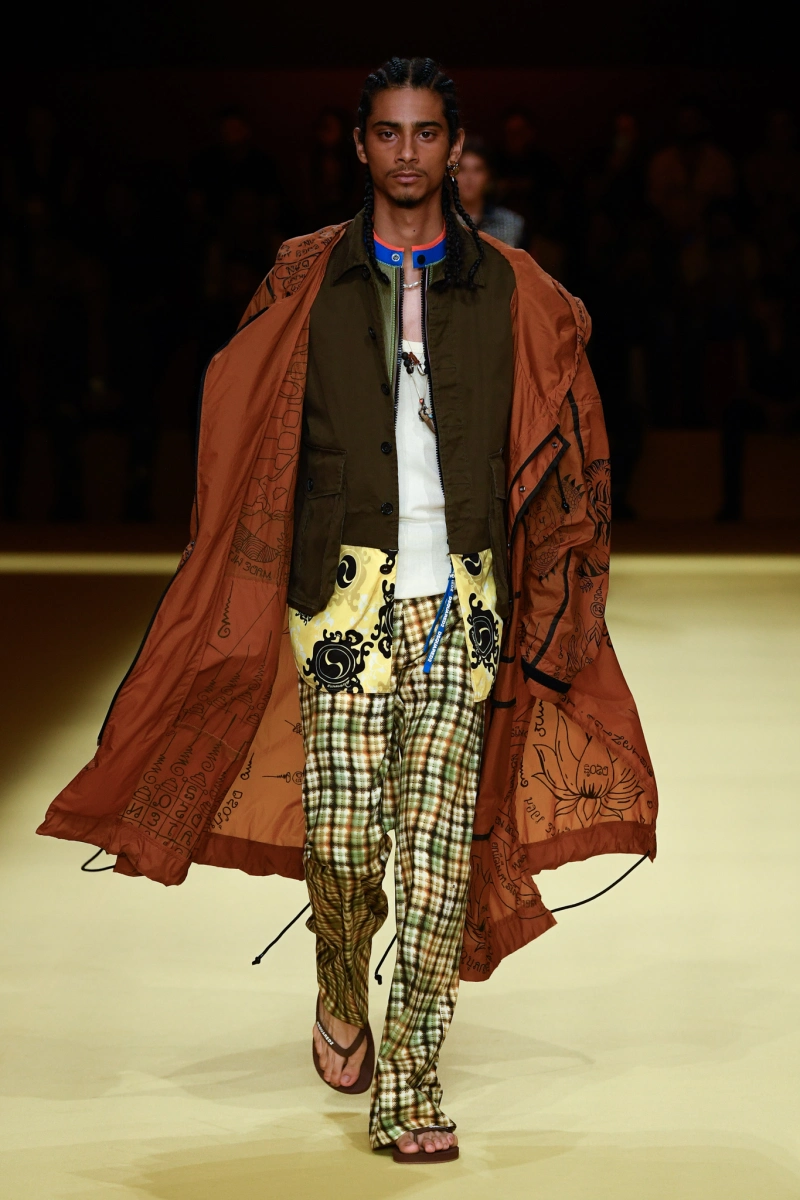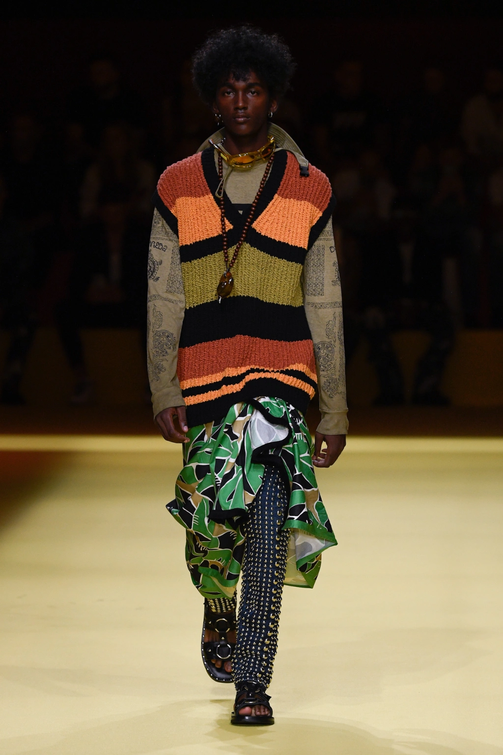 Further nods to Jamaica popped up through yellow-black-and-green striped knits among the heavily-layered looks the duo conjured. A clash of floral prints, checkered patterns, tie-dye effects, denim patchwork, nylon shorts and ‘70s flared pants dragged around the expansive runway, conveying a free-spirited attitude. Sarongs tied at the waist featured swirling designs and sun-like motifs in vibrant colors.