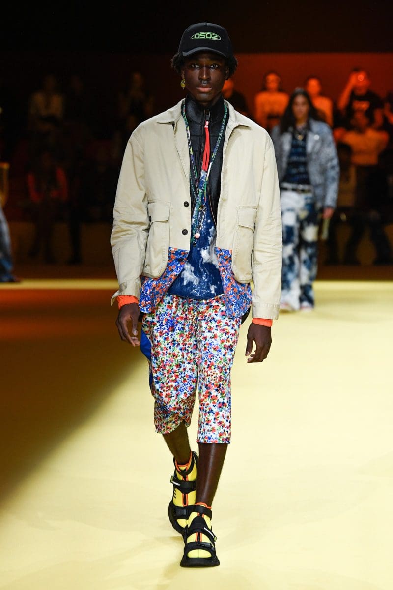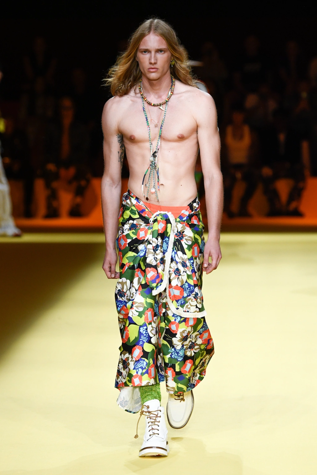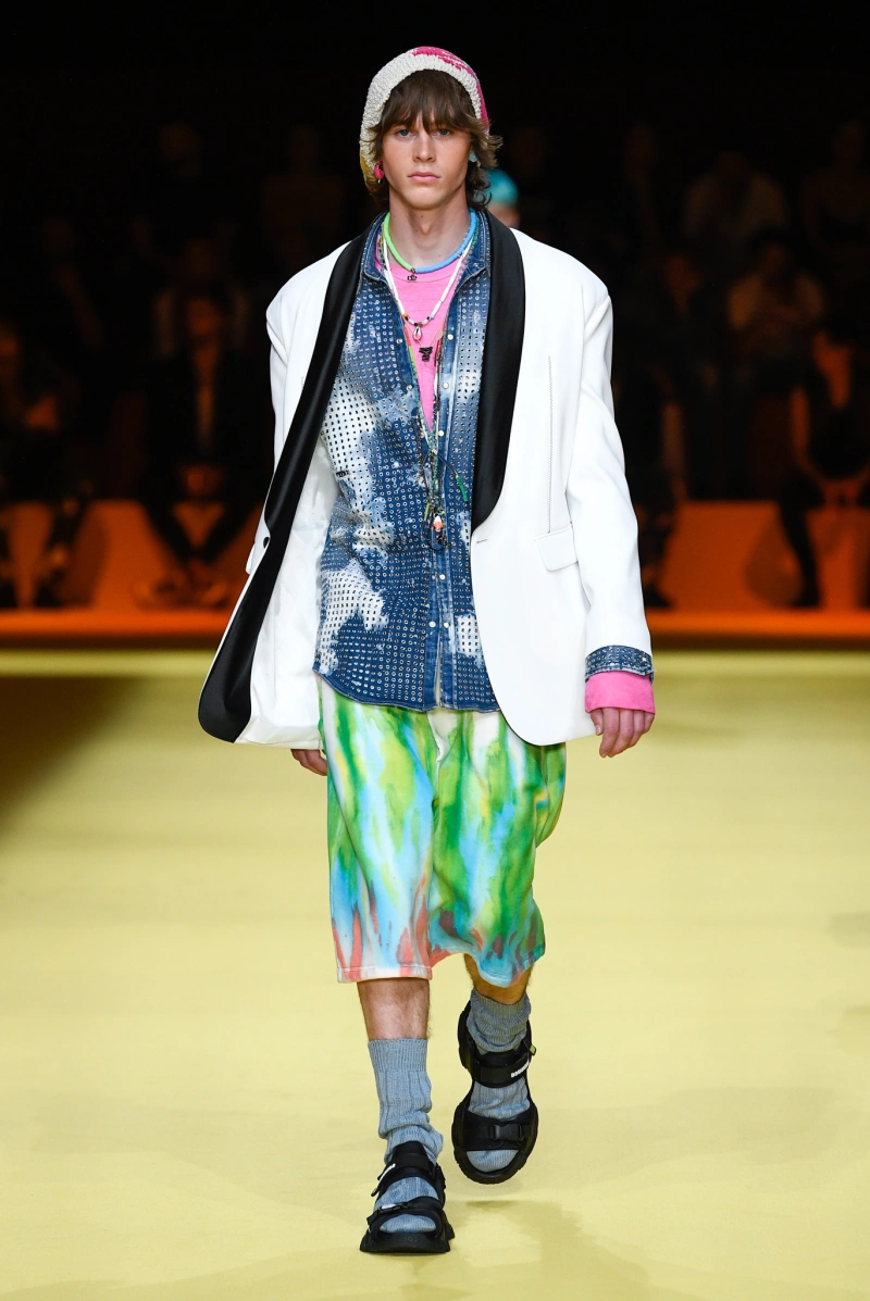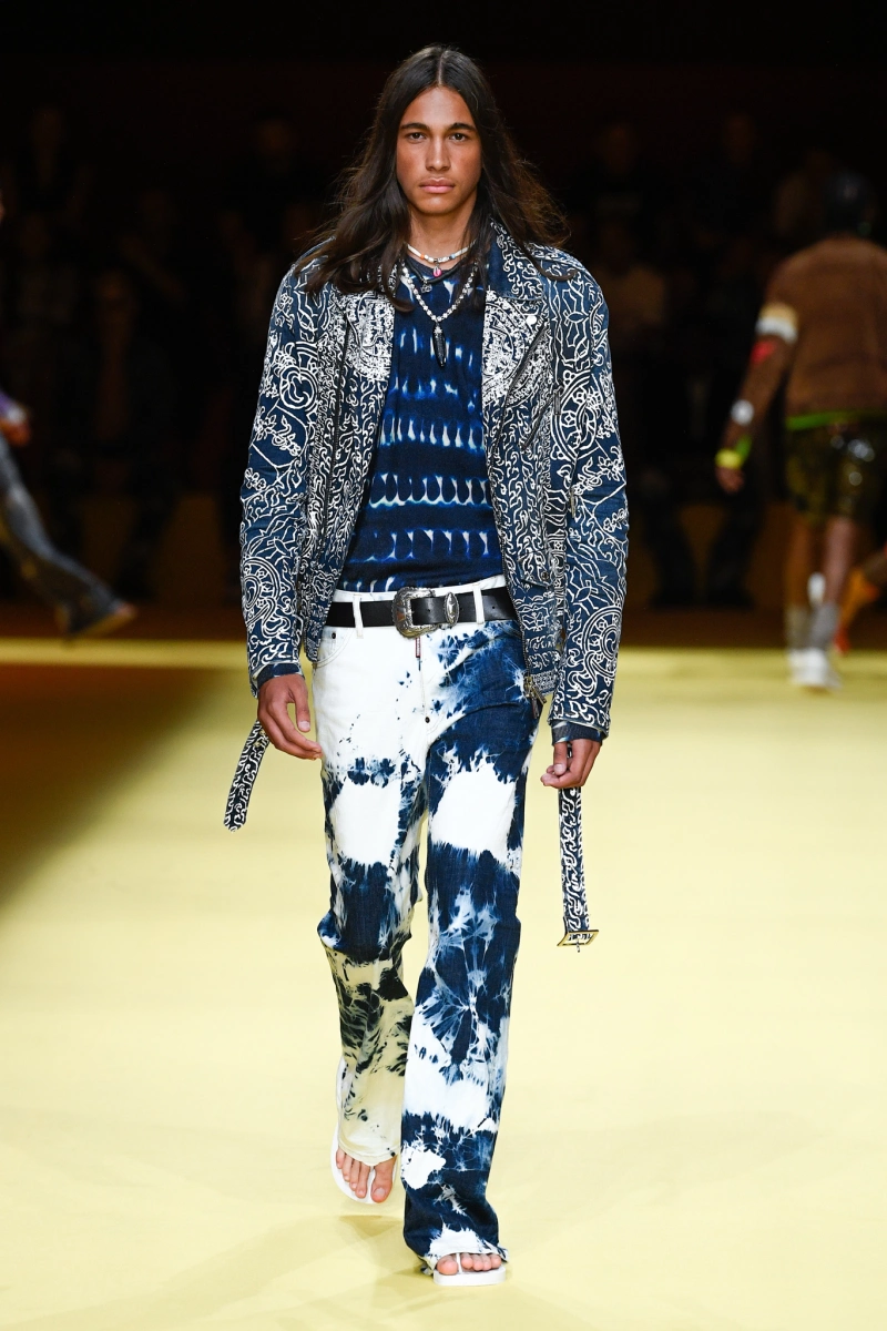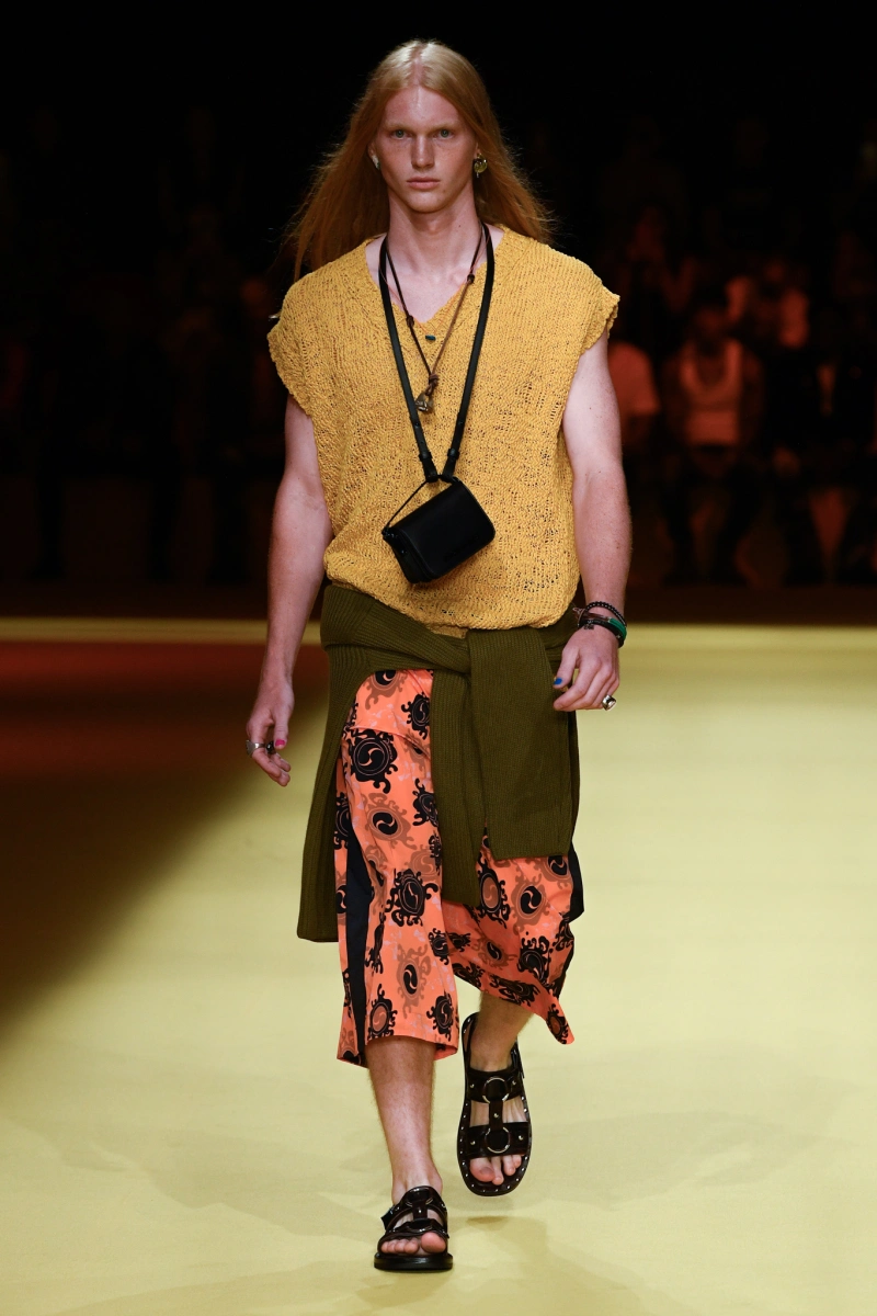 Further nods to Jamaica popped up through yellow-black-and-green striped knits among the heavily-layered looks the duo conjured. A clash of floral prints, checkered patterns, tie-dye effects, denim patchwork, nylon shorts and ‘70s flared pants dragged around the expansive runway, conveying a free-spirited attitude. Sarongs tied at the waist featured swirling designs and sun-like motifs in vibrant colors.