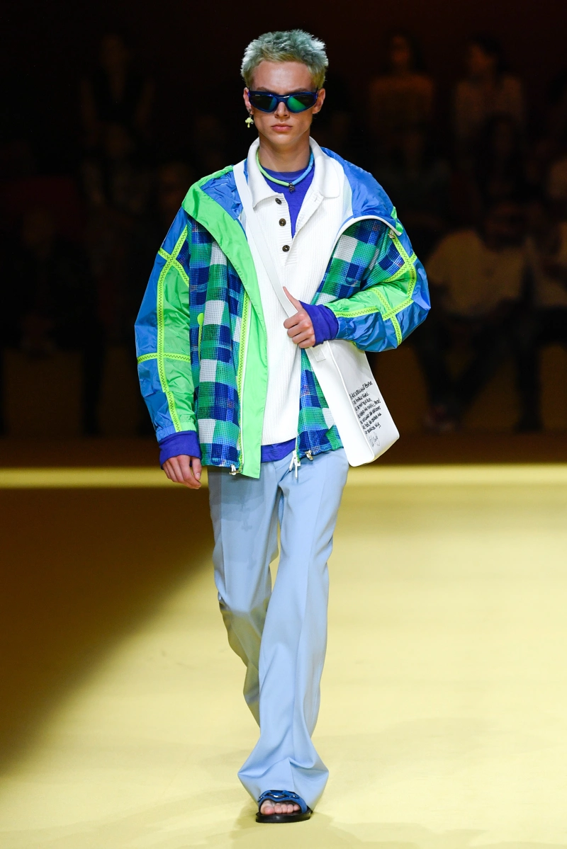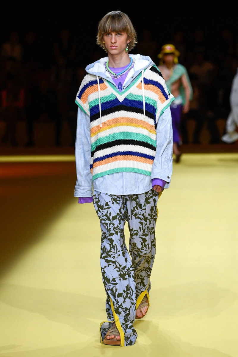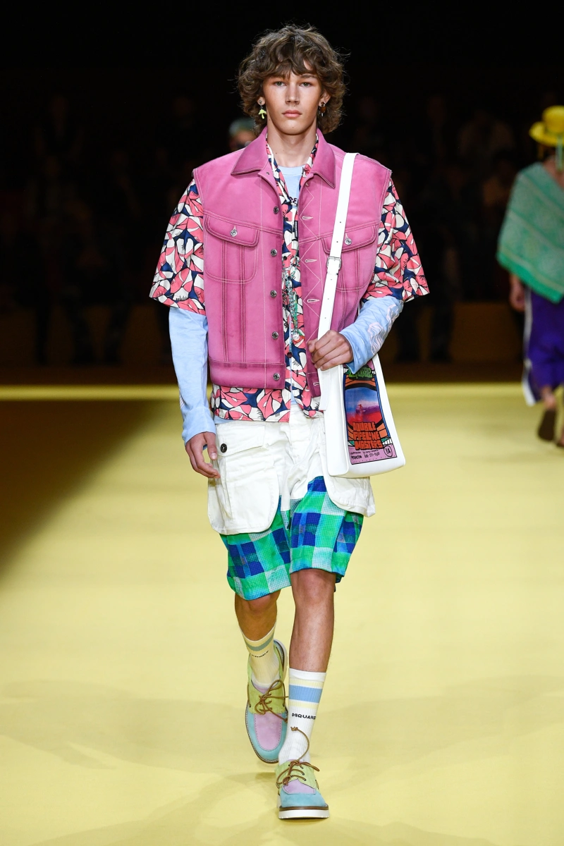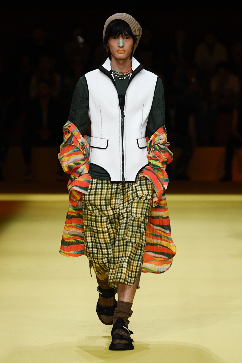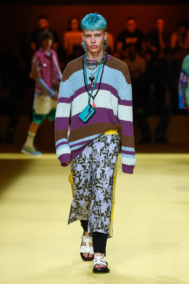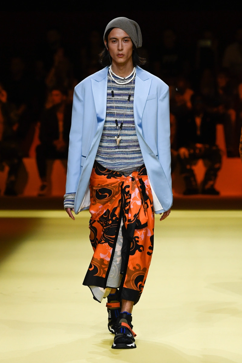 Further nods to Jamaica popped up through yellow-black-and-green striped knits among the heavily-layered looks the duo conjured. A clash of floral prints, checkered patterns, tie-dye effects, denim patchwork, nylon shorts and ‘70s flared pants dragged around the expansive runway, conveying a free-spirited attitude. Sarongs tied at the waist featured swirling designs and sun-like motifs in vibrant colors.