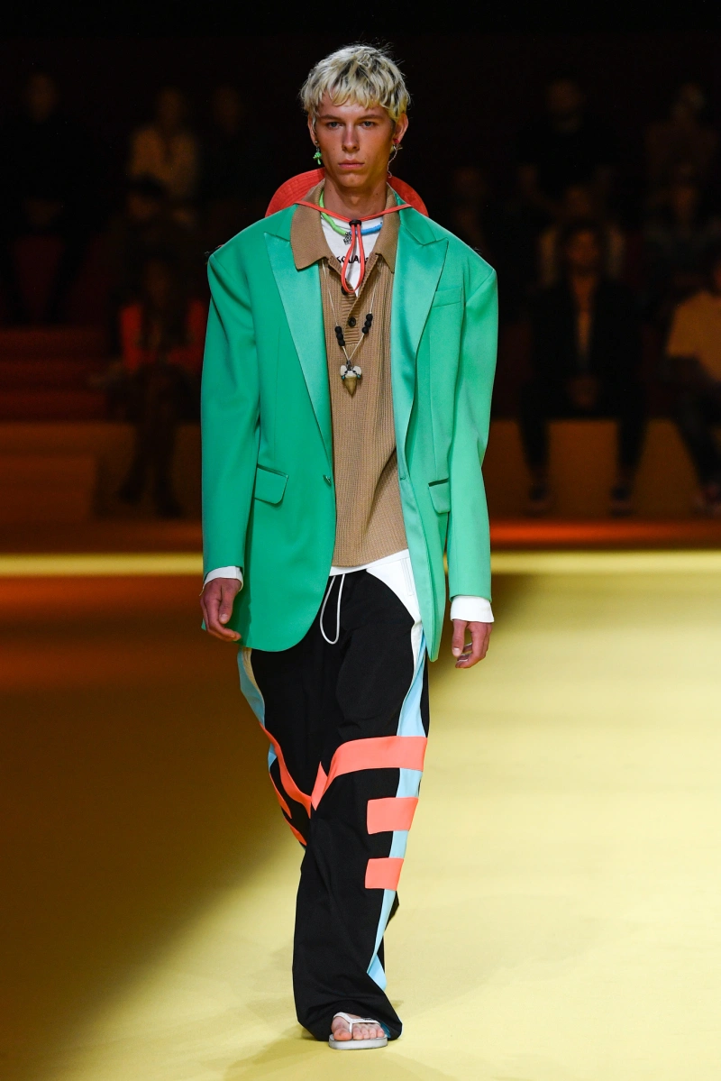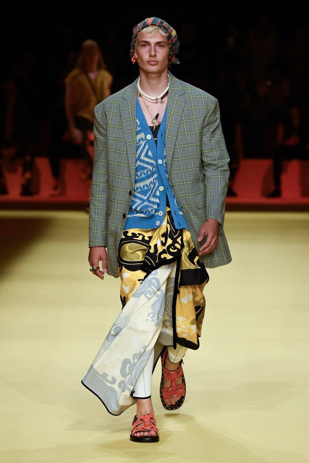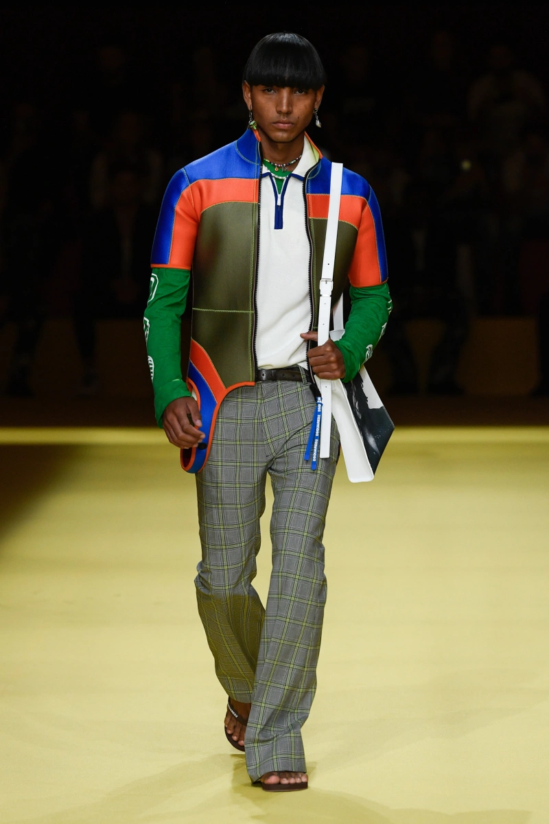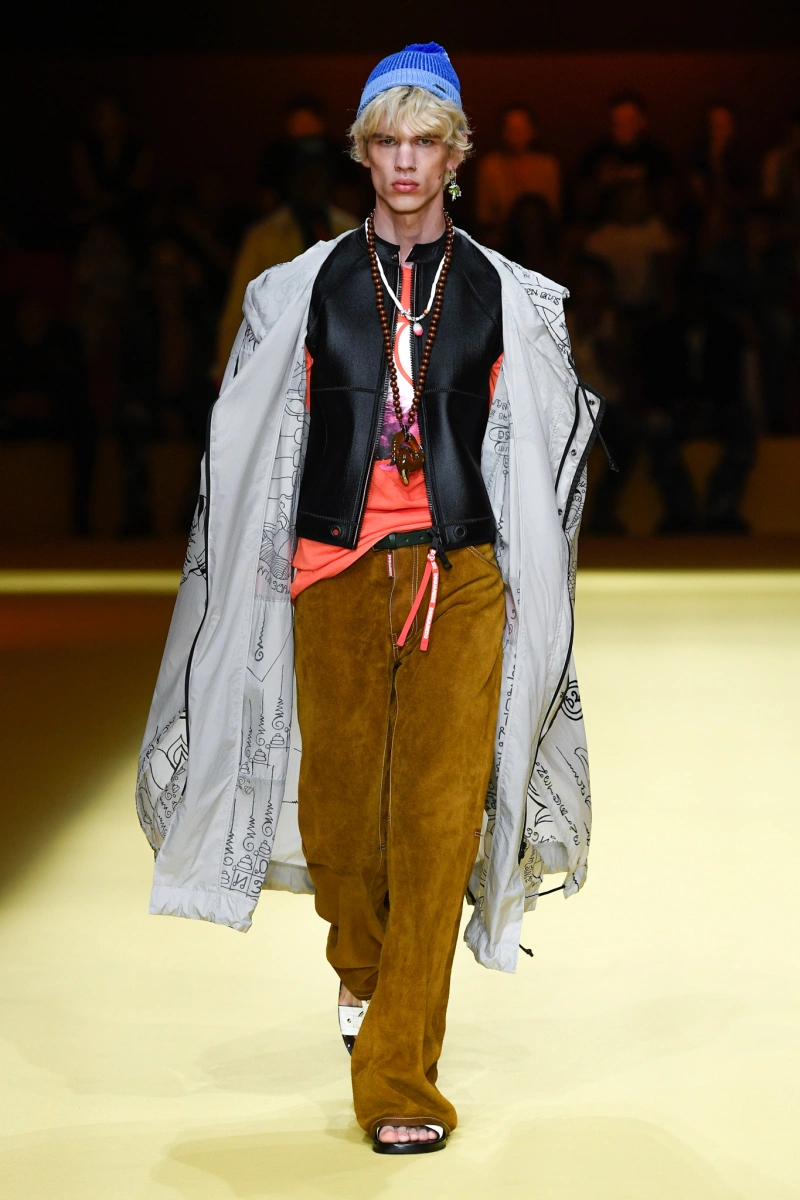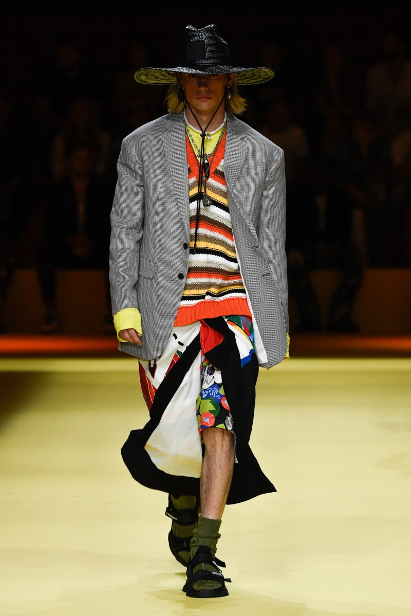 Further nods to Jamaica popped up through yellow-black-and-green striped knits among the heavily-layered looks the duo conjured. A clash of floral prints, checkered patterns, tie-dye effects, denim patchwork, nylon shorts and ‘70s flared pants dragged around the expansive runway, conveying a free-spirited attitude. Sarongs tied at the waist featured swirling designs and sun-like motifs in vibrant colors.