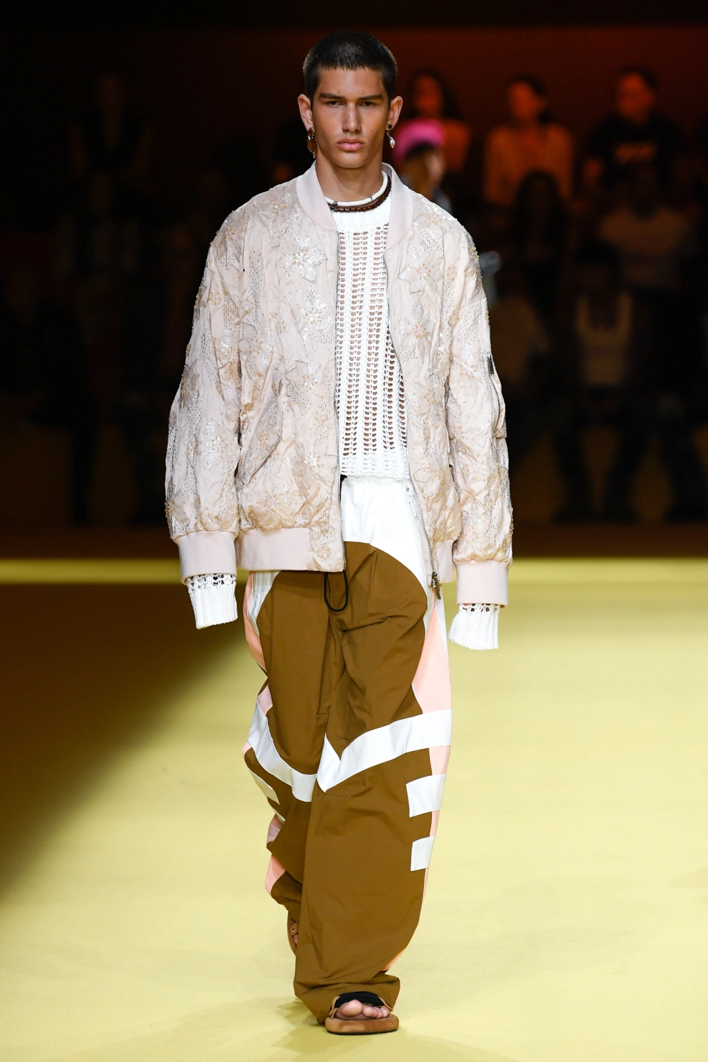 In the mix of layers, knitwear stood out with its oversize fit and bold patterns, as seen in distressed striped sweaters, graphic cardigans and mood-boosting crochet options with flowers. These pieces were mixed with loose tailoring featuring sloped shoulders, blazers shaped like scuba gear and fancy tuxedo jackets in white and baby blue.