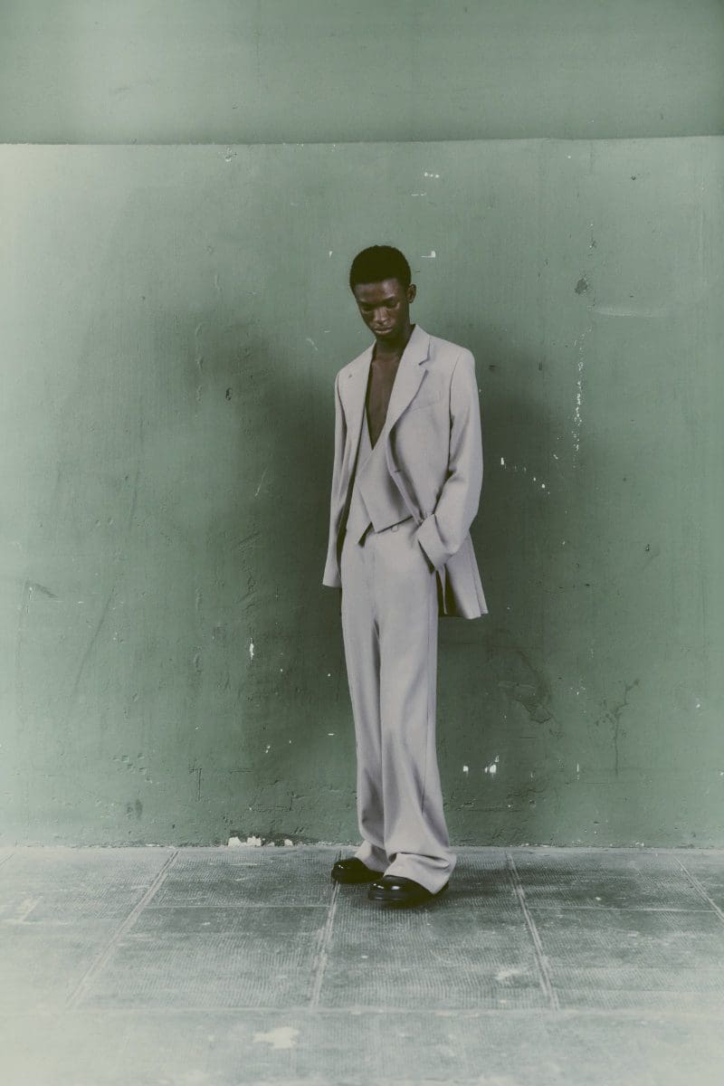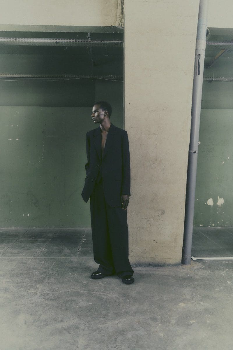 AMI’s collection is a masterclass in balancing timeless elegance with contemporary style. The grey three-piece suit, skillfully modeled by Ayomide Onasanya, exemplifies this balance, offering a classic silhouette with a modern twist. Meanwhile, Elias donned a matching leather jacket and pants set, showcasing the versatility of materials in creating cohesive looks.