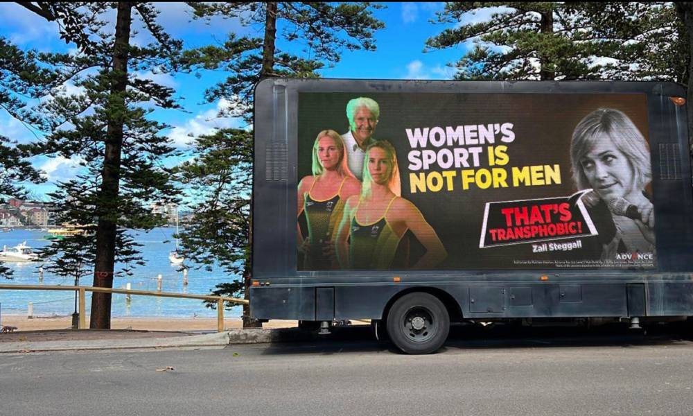 Conservative group Advance Australia organised mobile billboards targeting independent Warringah MP Zali Steggall, who is a staunch advocate for trans women’s inclusion in sports. The billboards include the slogan “women’s sport is not for men” as well as photos of top swimmers Dawn Fraser, Emma McKeon and Seebohm.