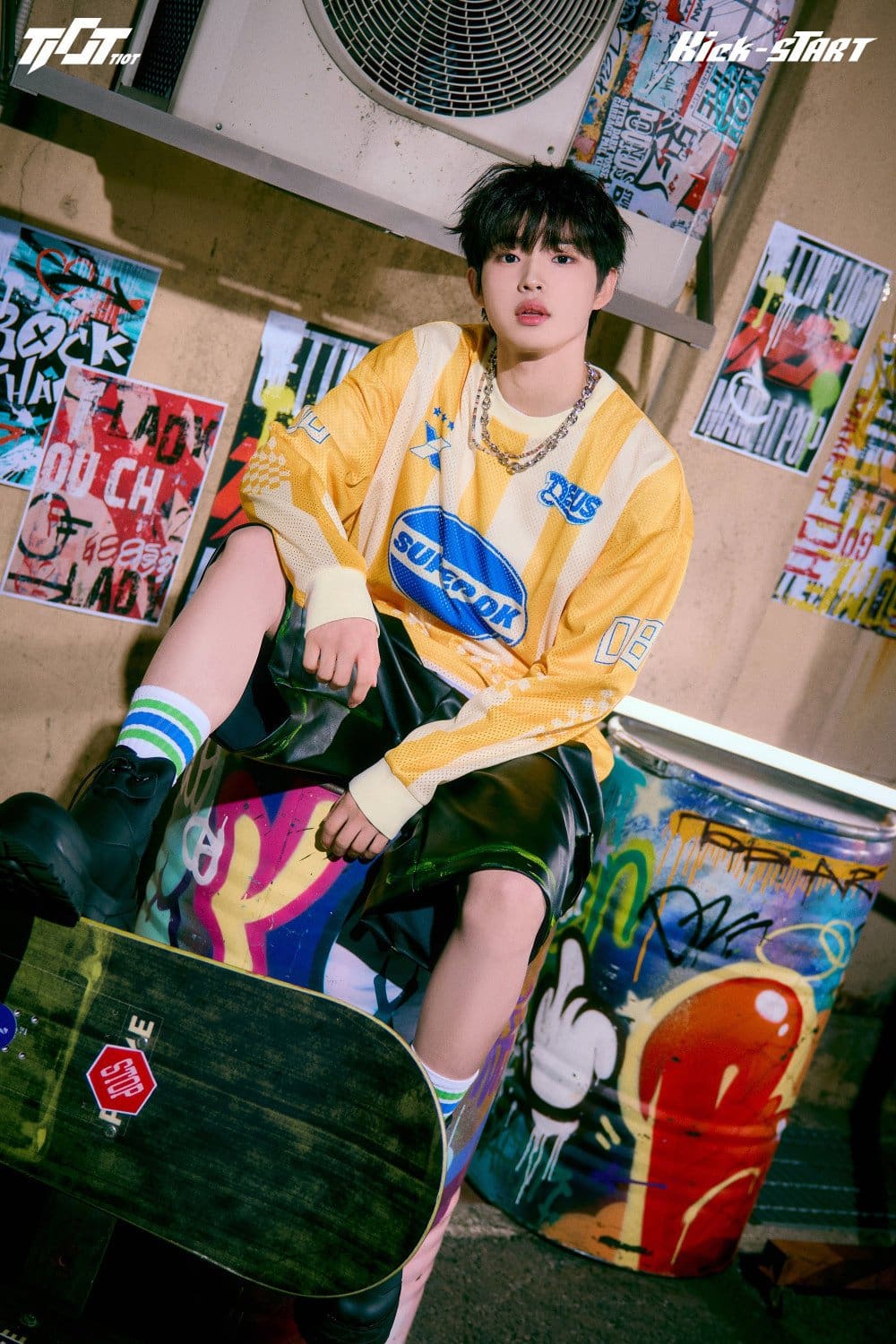 Capturing the essence of “geek chic”, the ‘Kick’ version presents the ensemble—Kim Minseong, Kum Junhyeon, Hong Keonhee, Choi Woojin, and Shin Yechan—in vibrant hues that exude youthful exuberance. Switching gears, the ‘Start’ version flips the narrative to a more intense aura, where the group’s edgier side is foregrounded against a sleek black backdrop, hinting at the diverse artistic range they are set to offer.