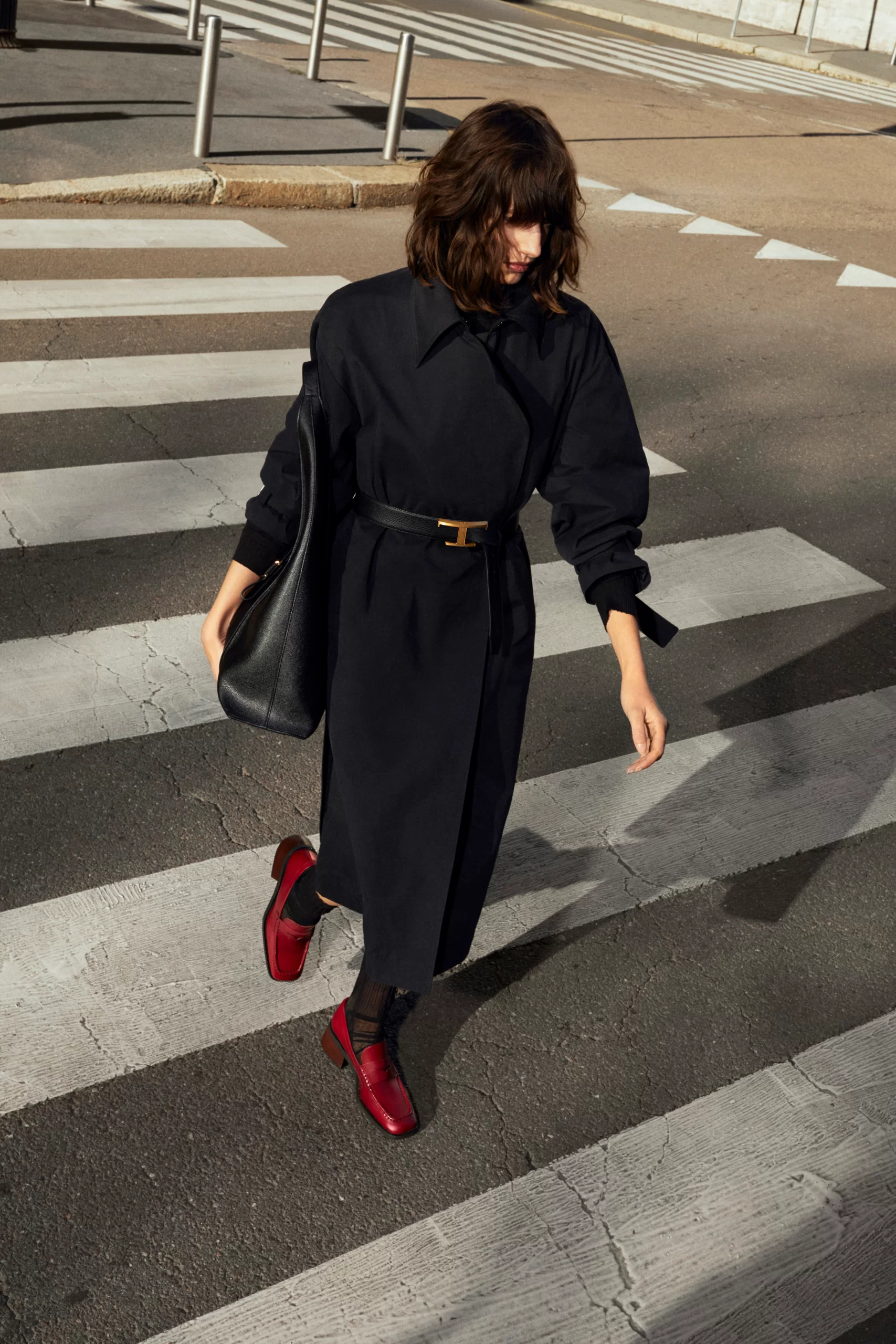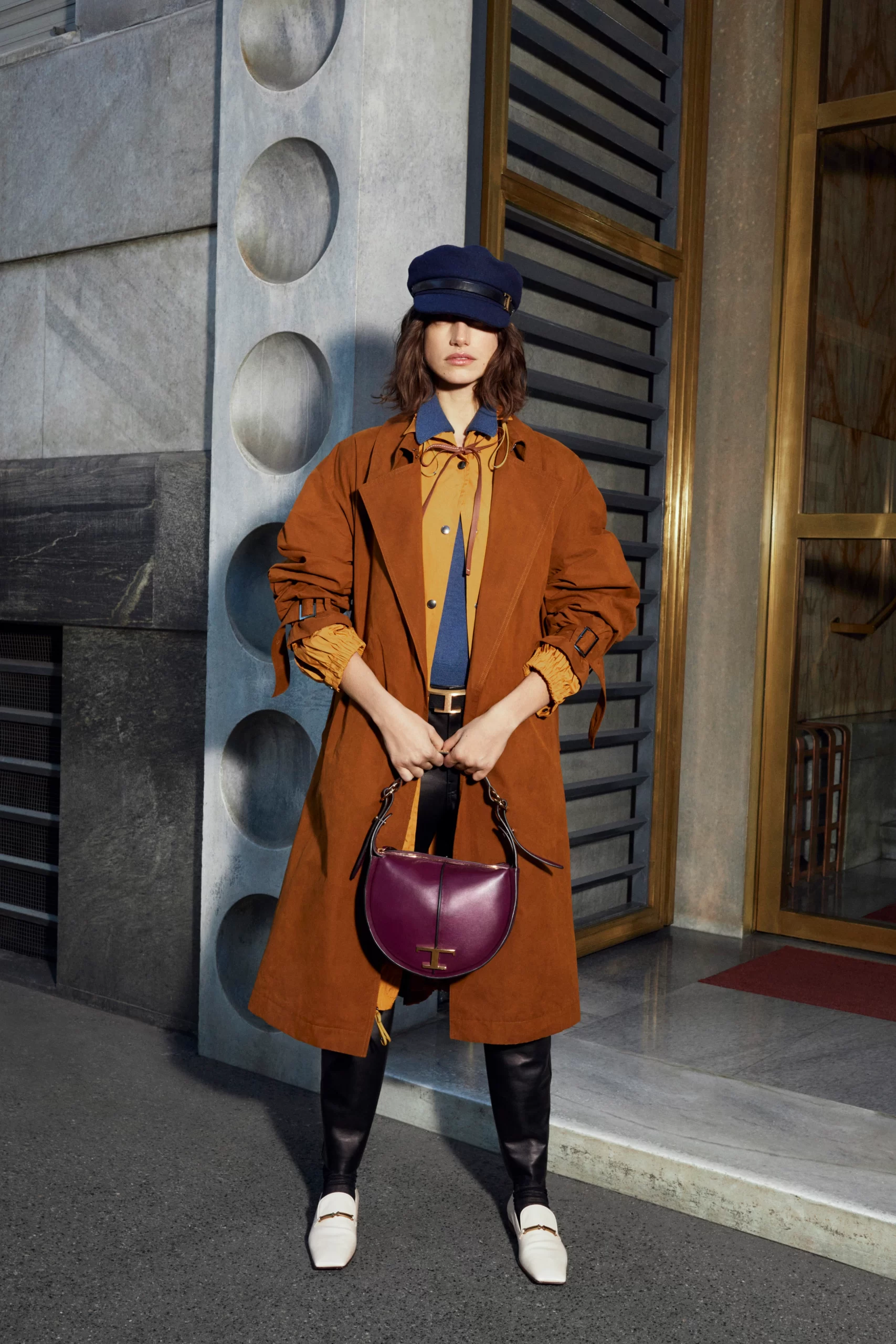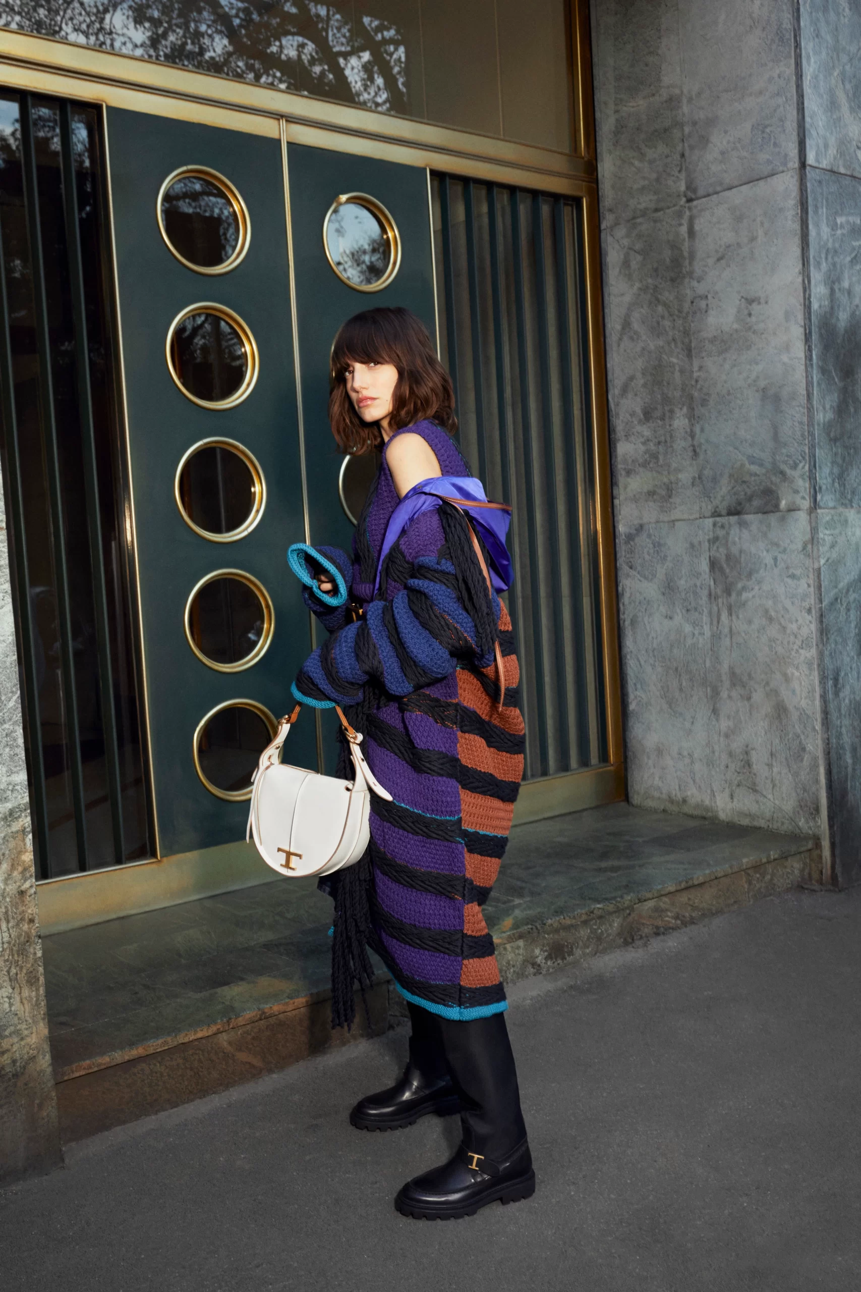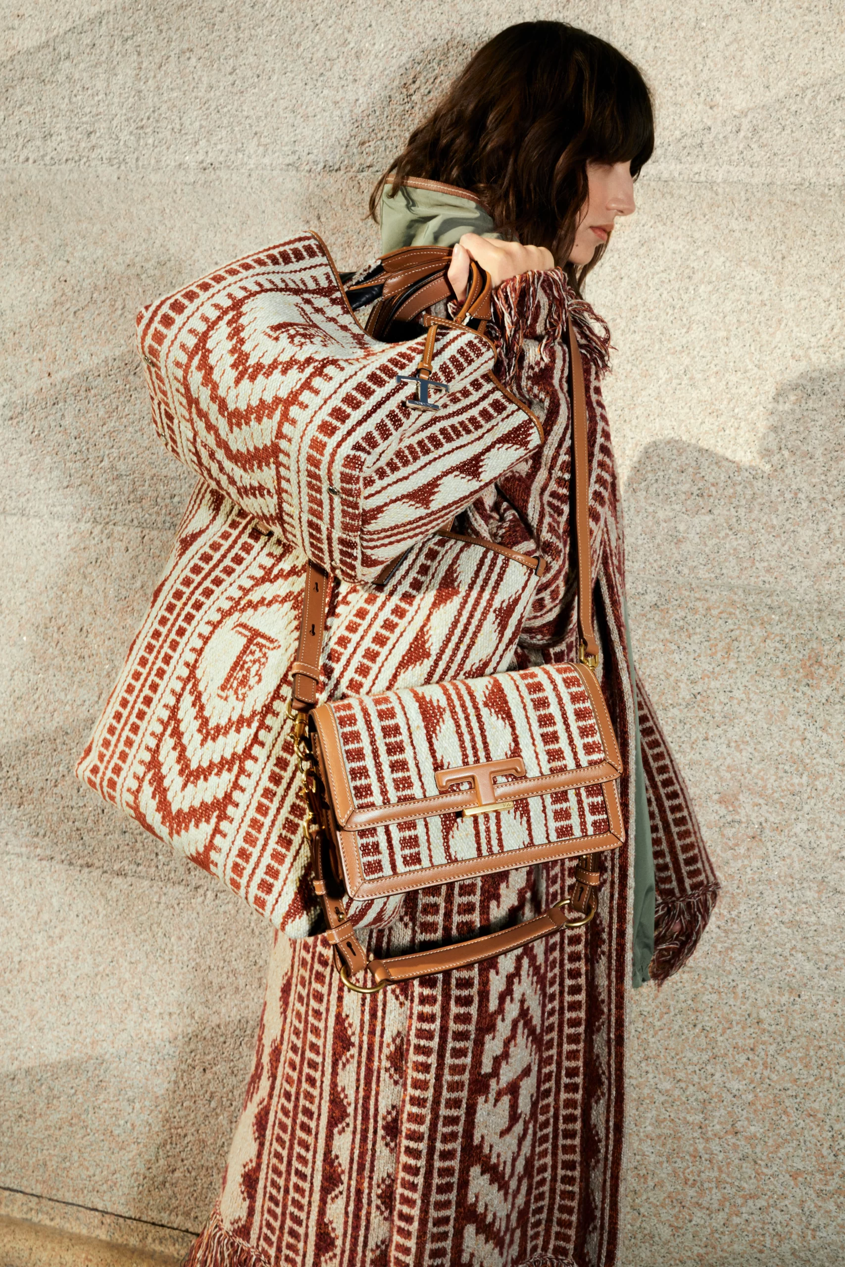 Hence the array of different styles showcased, ranging from oversize trenchcoats and quilted parkas to a knitted wrap coat nodding to kilim carpets and shown with matching bags. Chiapponi’s penchant for knitwear also was displayed in an elongated striped cardigan with chunky fringe that had a grungy feel, while the house’s signature leather and Gommino pebble motif were used on a classic, ’50s-inspired denim jacket via eccentric patches on the sleeves. “I like how our Gommino [pebble-sole] leaves a distinctive trace when you walk, so I wanted it to leave a mark in the ready to wear, too,” Chiapponi said.
