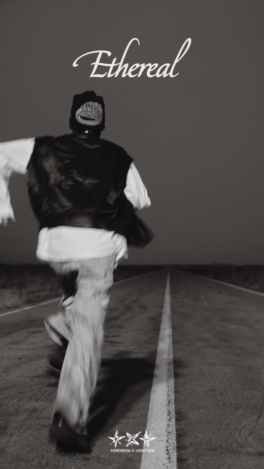 Adding to the atmosphere, the subsequent images reveal the TXT members in a full sprint along an empty highway, heading toward an undefined vanishing point. This dramatic imagery plays into the enigmatic theme of the group’s upcoming release, capturing fans’ imaginations and curiosity.