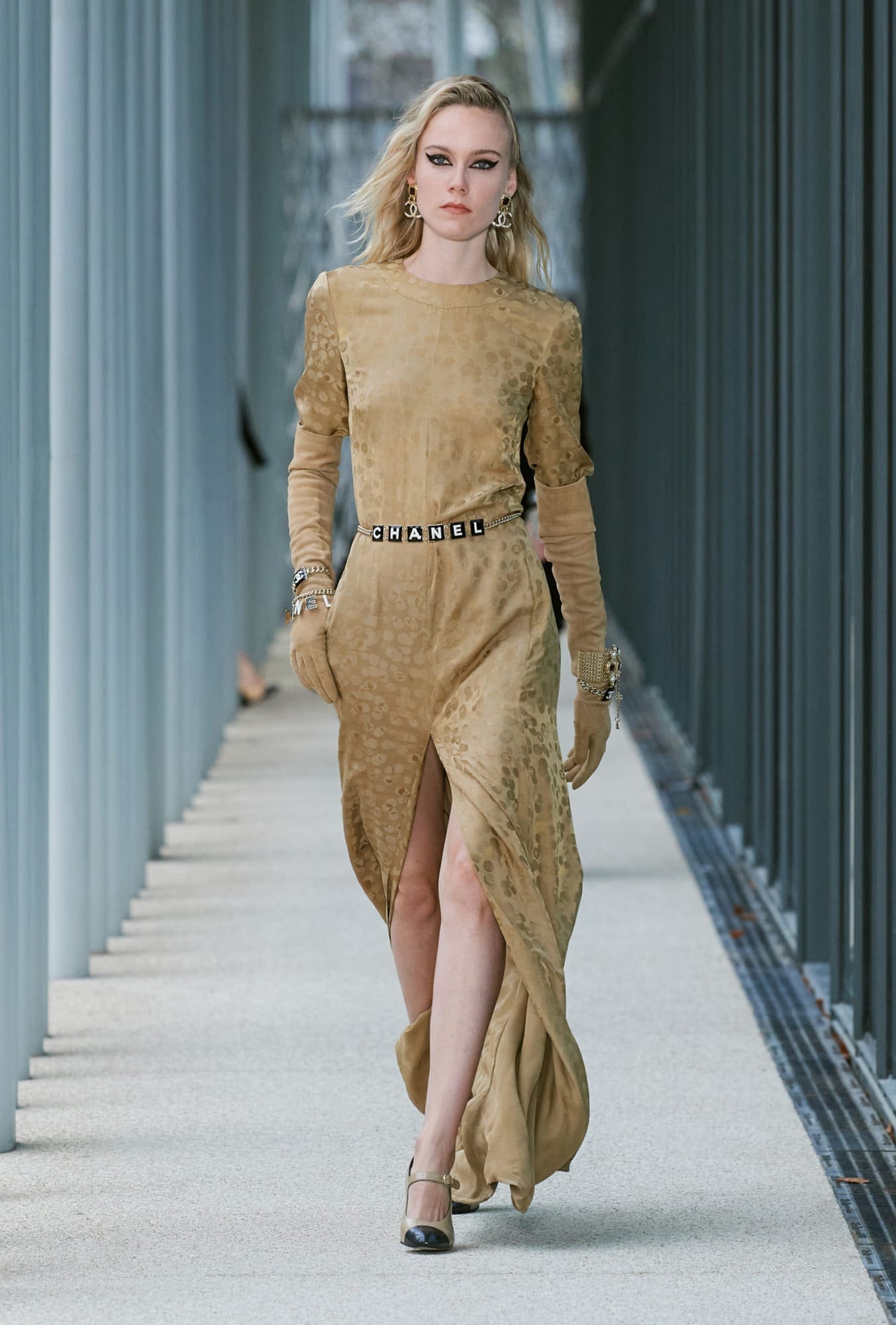 It’s one of Viard’s most cohesive collections to date. She has long been a fan of what I’d call a challenging silhouette; think knit Bermuda shorts, maxi-length dresses with no defined waist, baggy jeans with an elastic waistband. They’re tricky to pull off when balanced with her more commercial instincts. Those are all present here, too, but they looked much better tempered by the delicate craftwork of the maisons. A matching camel knit-and-legging set called to mind the bodysuits created for the Spring 2021 collection, but got a sophisticated upgrade layered under a shaggy cape and armfuls of ornate bangles; capri-length leggings were much more successful paired with sweeping, floor-length tweed coats than they were with miniskirts.