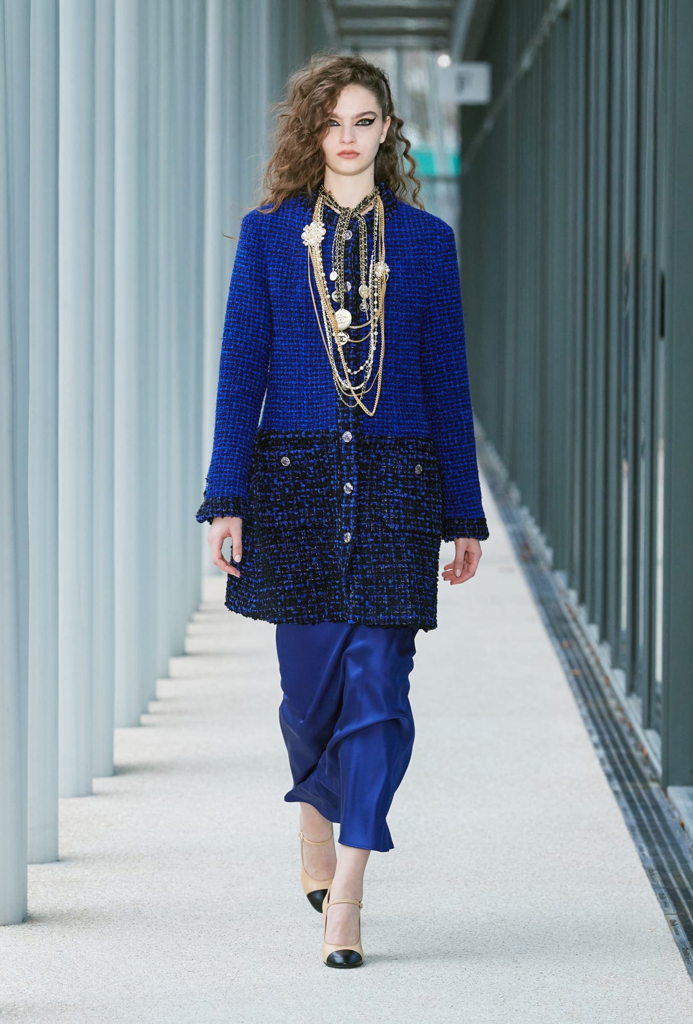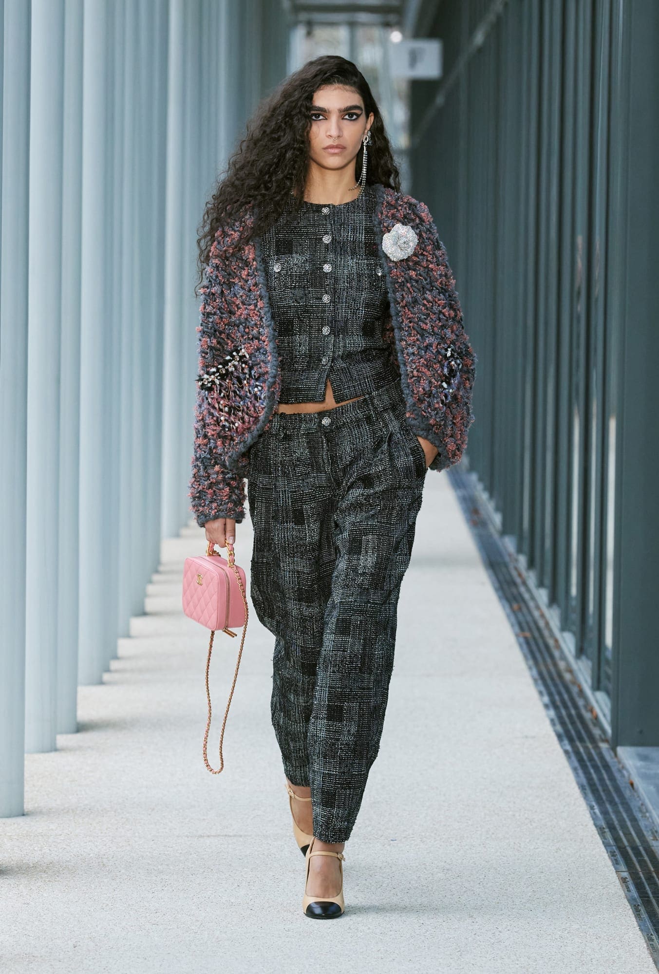 But the specialists themselves have perhaps never been so literally a source of inspiration as they were on Tuesday. The 2022 Métiers d’Art collection is “very metropolitan yet sophisticated, with tweed jackets with sweatshirt sleeves, graffiti-style embroidery in coloured beads by Lesage, voluminous purple or royal blue knit Bermuda short-outfits, and casual coats worn open,” per Viard. “Many of the embroideries are inspired by the structure of the building itself, such as those by Montex, which are very graphic and in silver sequins.”