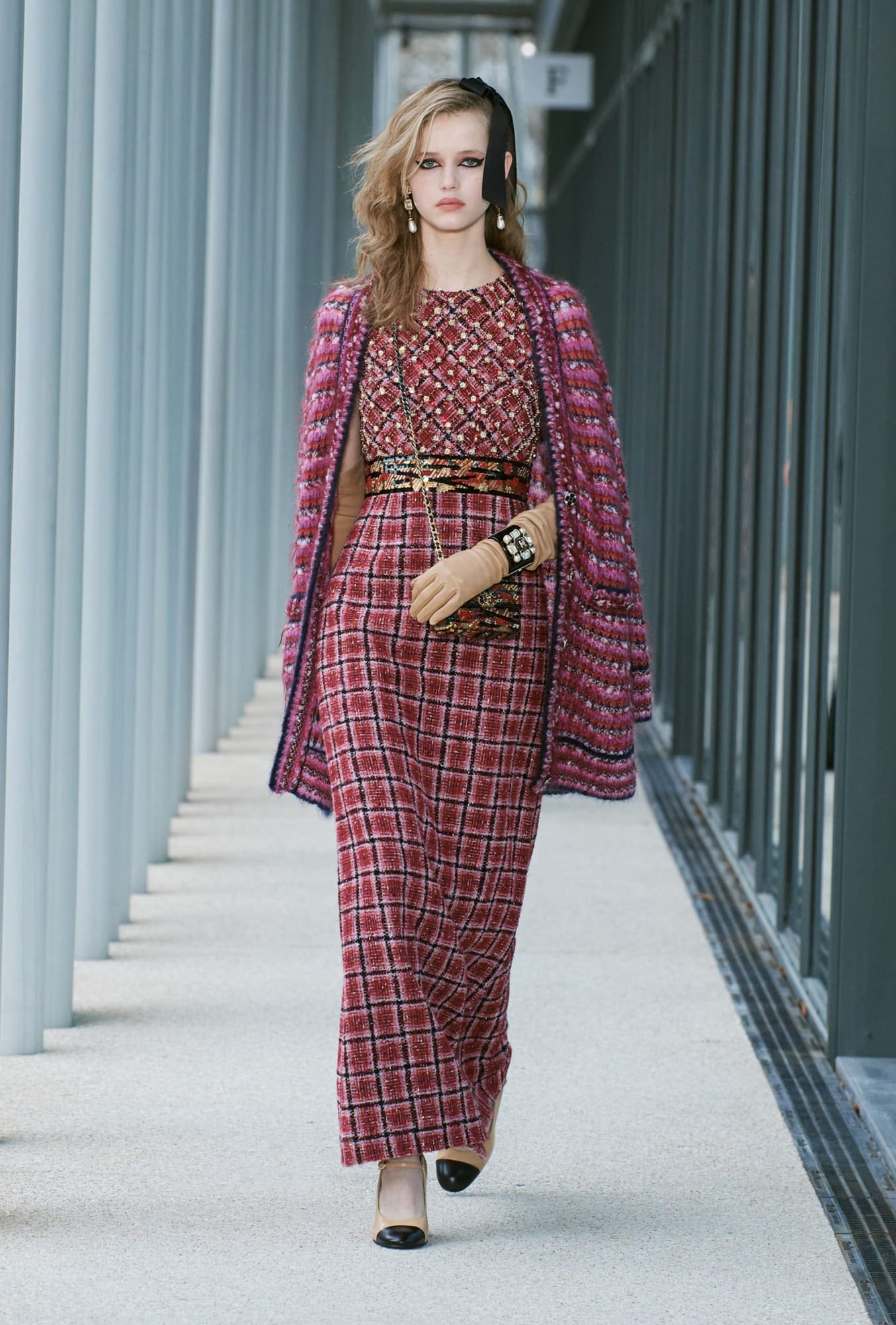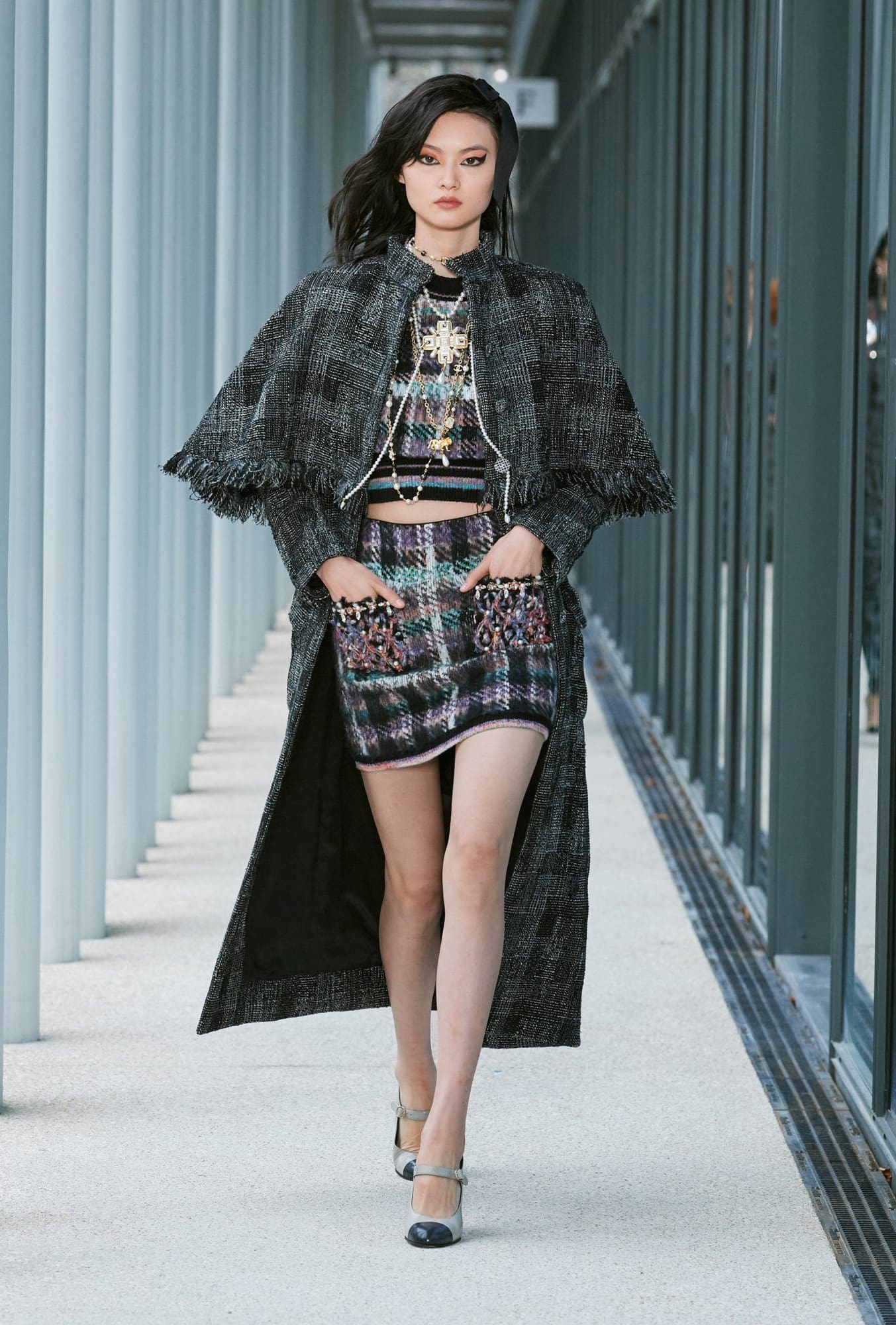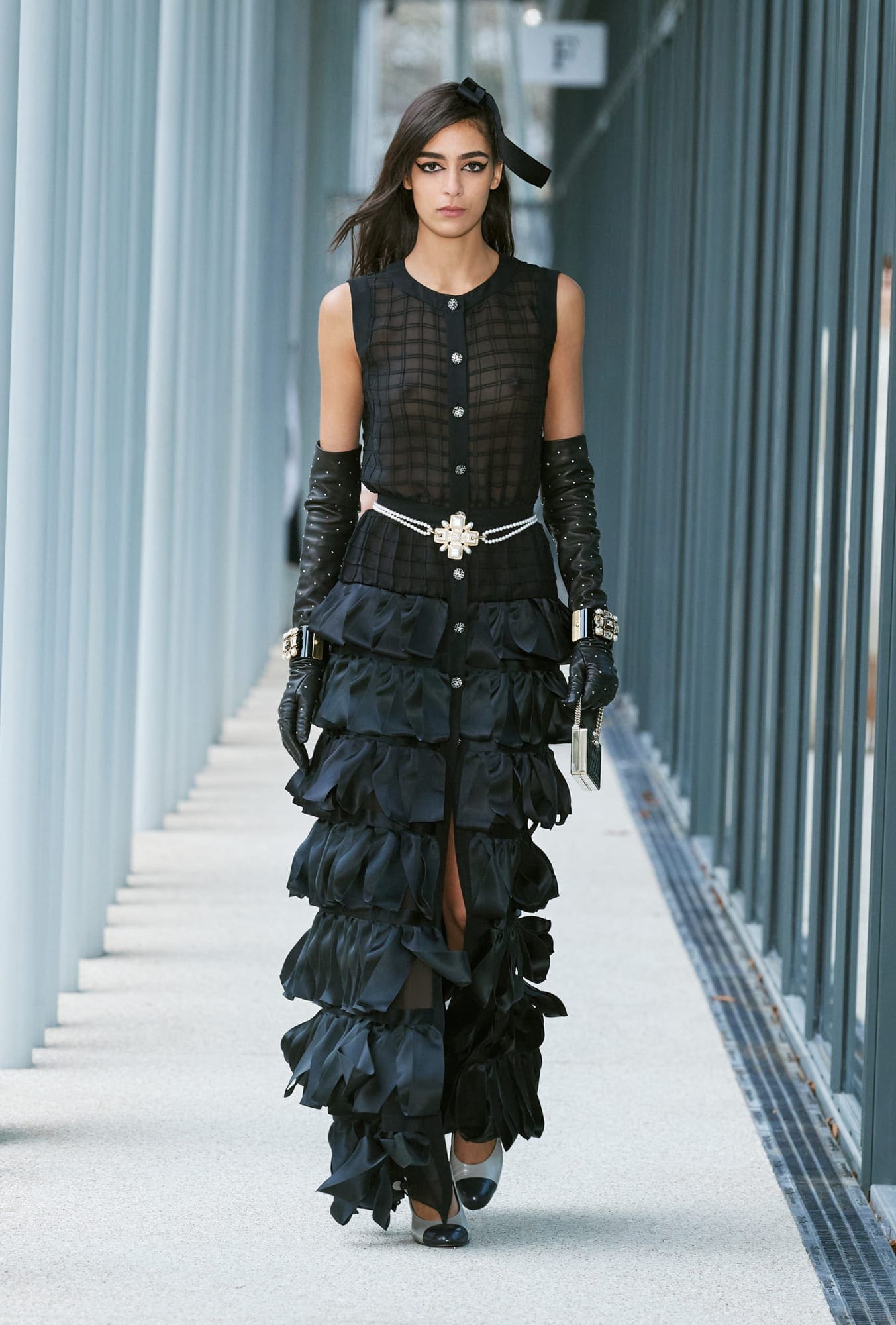 More importantly, there were some truly covetable pieces in the mix. There will almost certainly be a mad dash for those double-C cardigans and for that double-C pleated miniskirt, no matter the cost (and for the latter, that price will probably be high; it’s reportedly the most complicated pleating job Lognon has ever done for Chanel). More nods to the Gen-Z customer came with micro belts at the occasionally bare waist, which featured tiny bows; and those giant black hair bows, so haphazardly placed, will surely fly off shelves. Also chic were Viard’s maxi-length skirts opened high up the thigh.