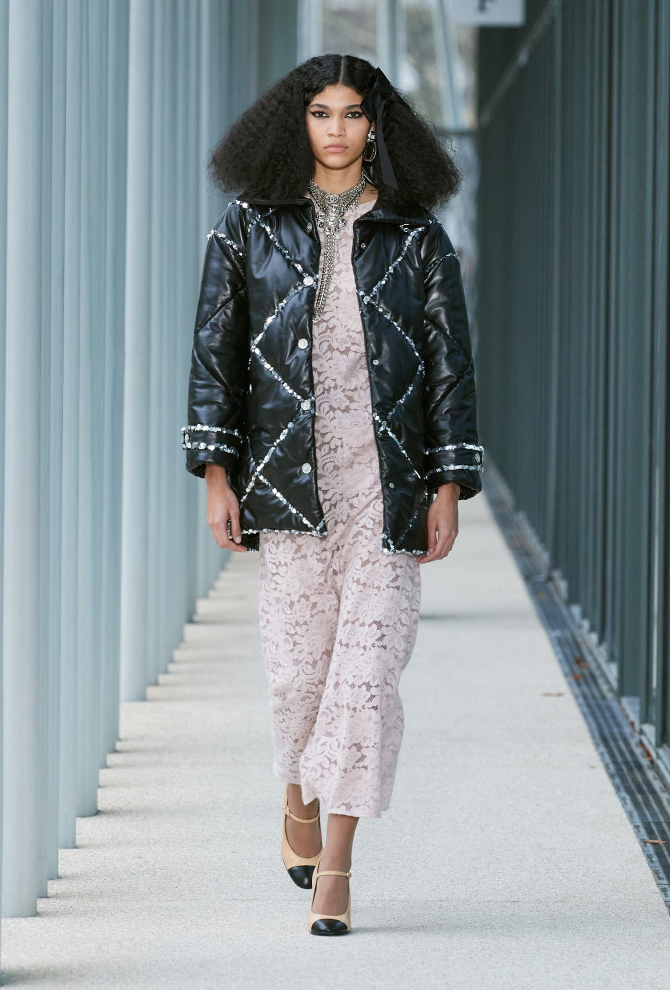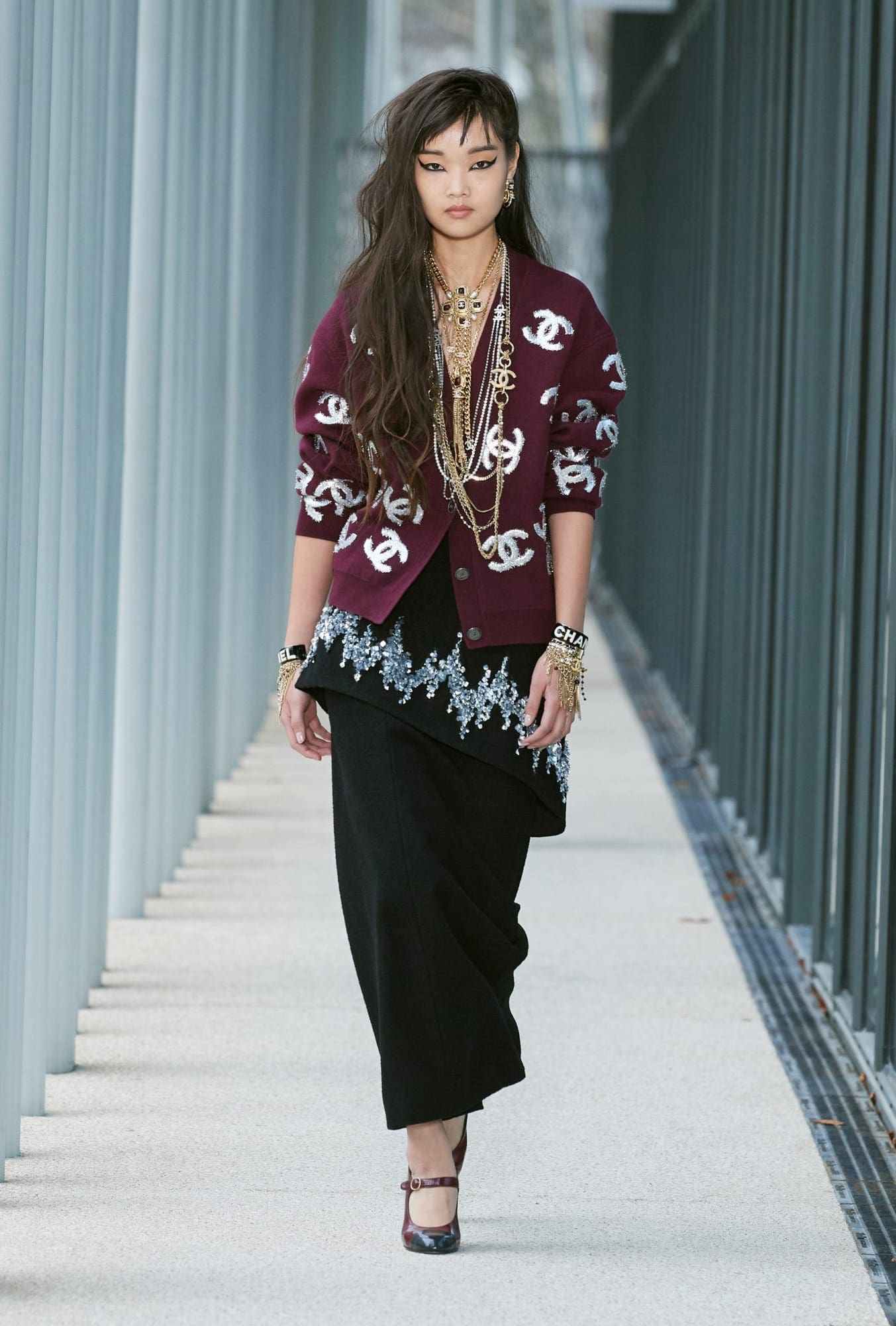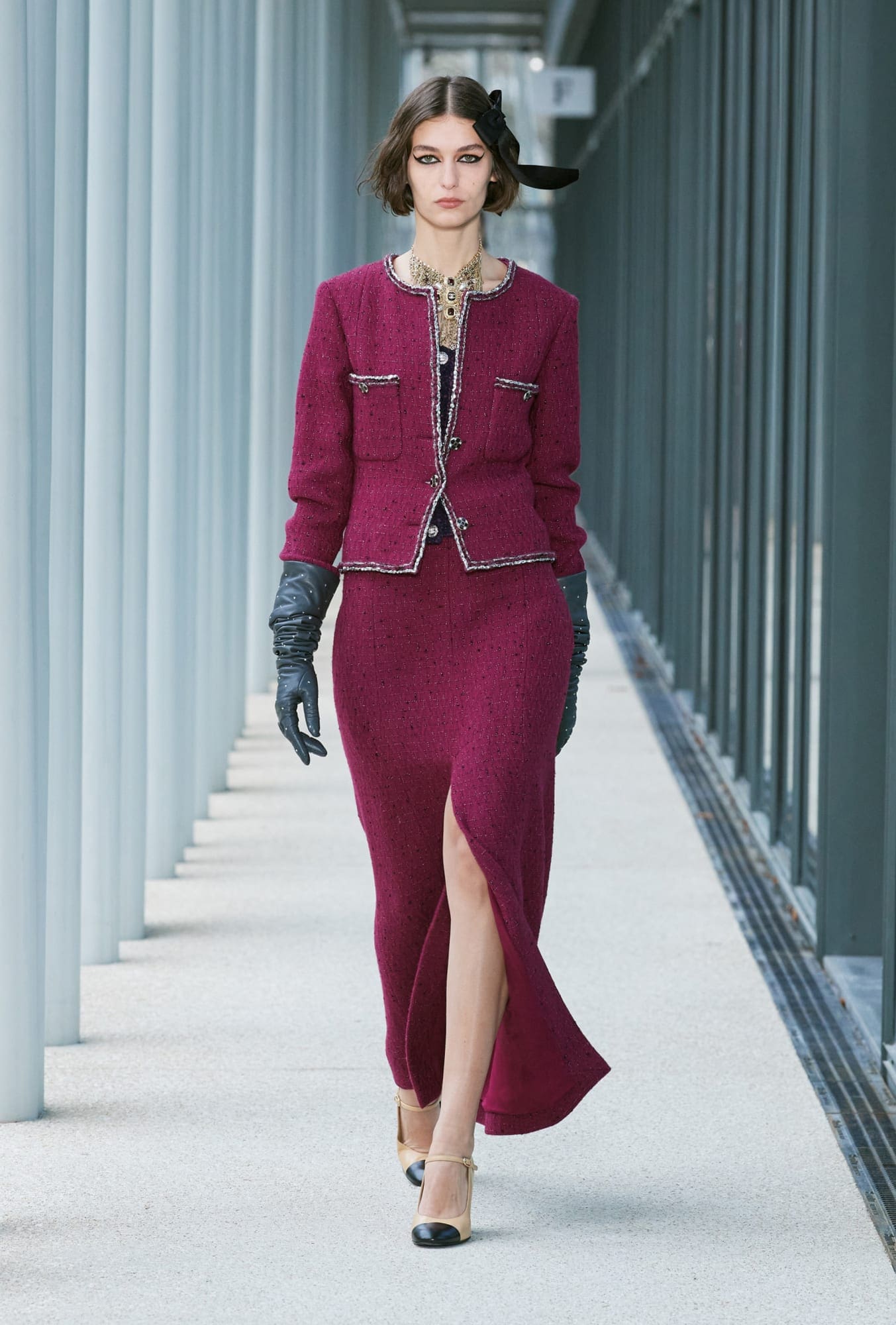 More importantly, there were some truly covetable pieces in the mix. There will almost certainly be a mad dash for those double-C cardigans and for that double-C pleated miniskirt, no matter the cost (and for the latter, that price will probably be high; it’s reportedly the most complicated pleating job Lognon has ever done for Chanel). More nods to the Gen-Z customer came with micro belts at the occasionally bare waist, which featured tiny bows; and those giant black hair bows, so haphazardly placed, will surely fly off shelves. Also chic were Viard’s maxi-length skirts opened high up the thigh.