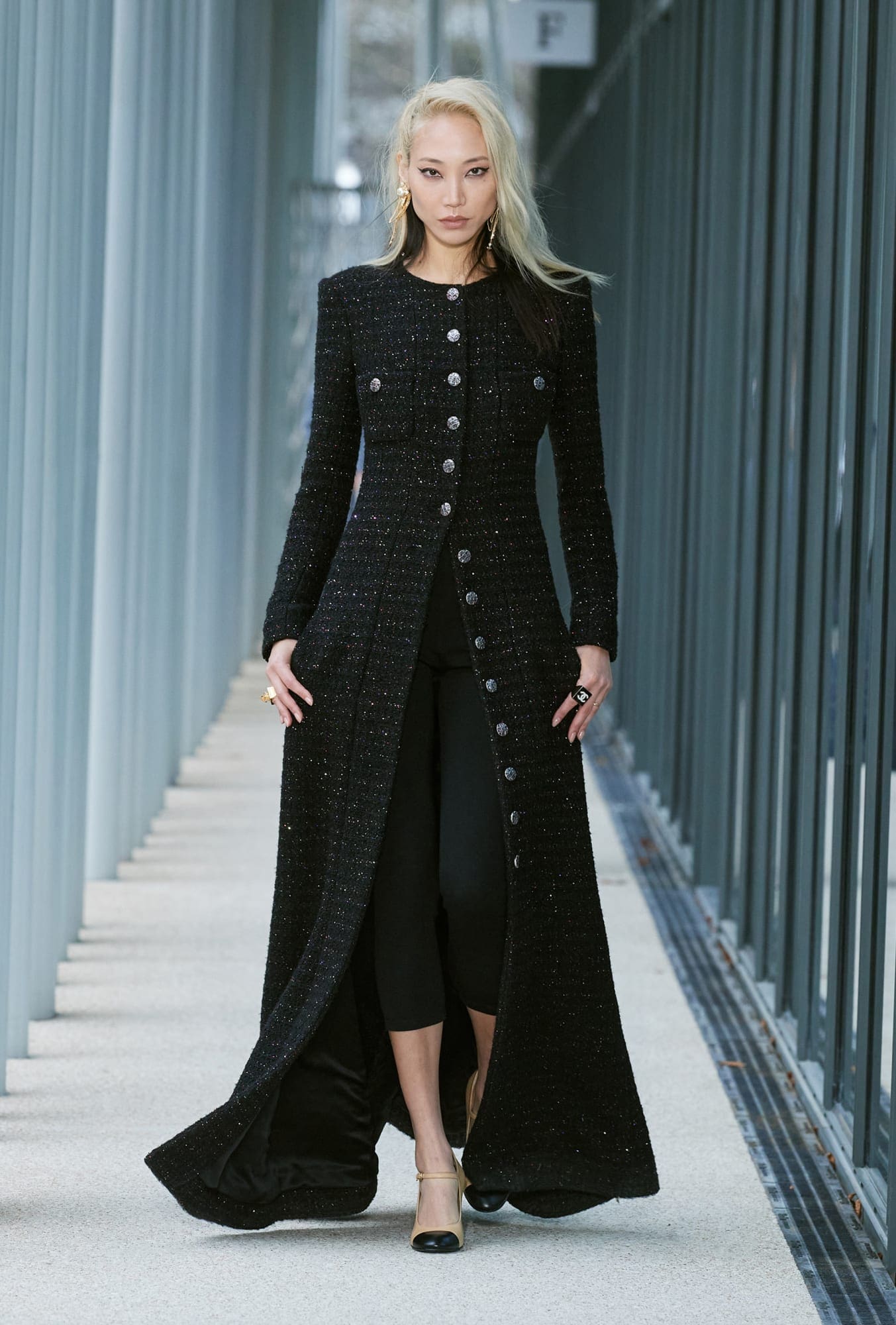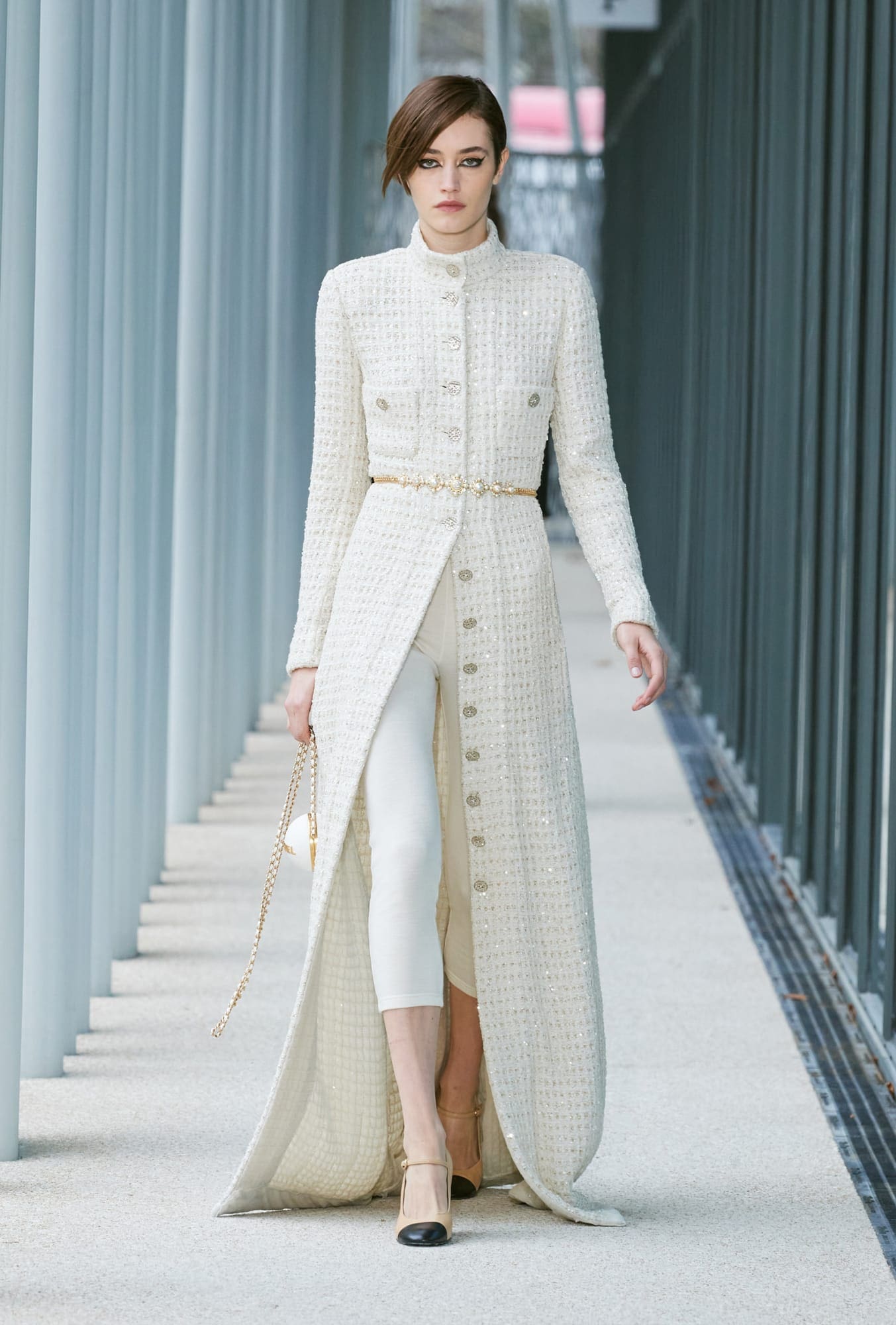 It’s one of Viard’s most cohesive collections to date. She has long been a fan of what I’d call a challenging silhouette; think knit Bermuda shorts, maxi-length dresses with no defined waist, baggy jeans with an elastic waistband. They’re tricky to pull off when balanced with her more commercial instincts. Those are all present here, too, but they looked much better tempered by the delicate craftwork of the maisons. A matching camel knit-and-legging set called to mind the bodysuits created for the Spring 2021 collection, but got a sophisticated upgrade layered under a shaggy cape and armfuls of ornate bangles; capri-length leggings were much more successful paired with sweeping, floor-length tweed coats than they were with miniskirts.